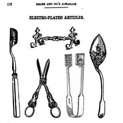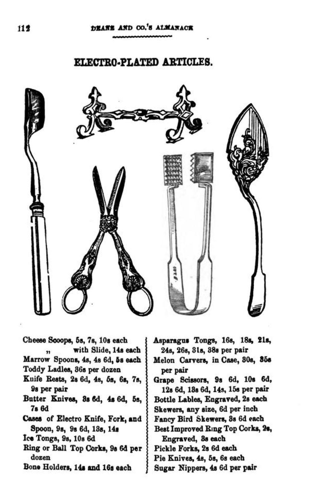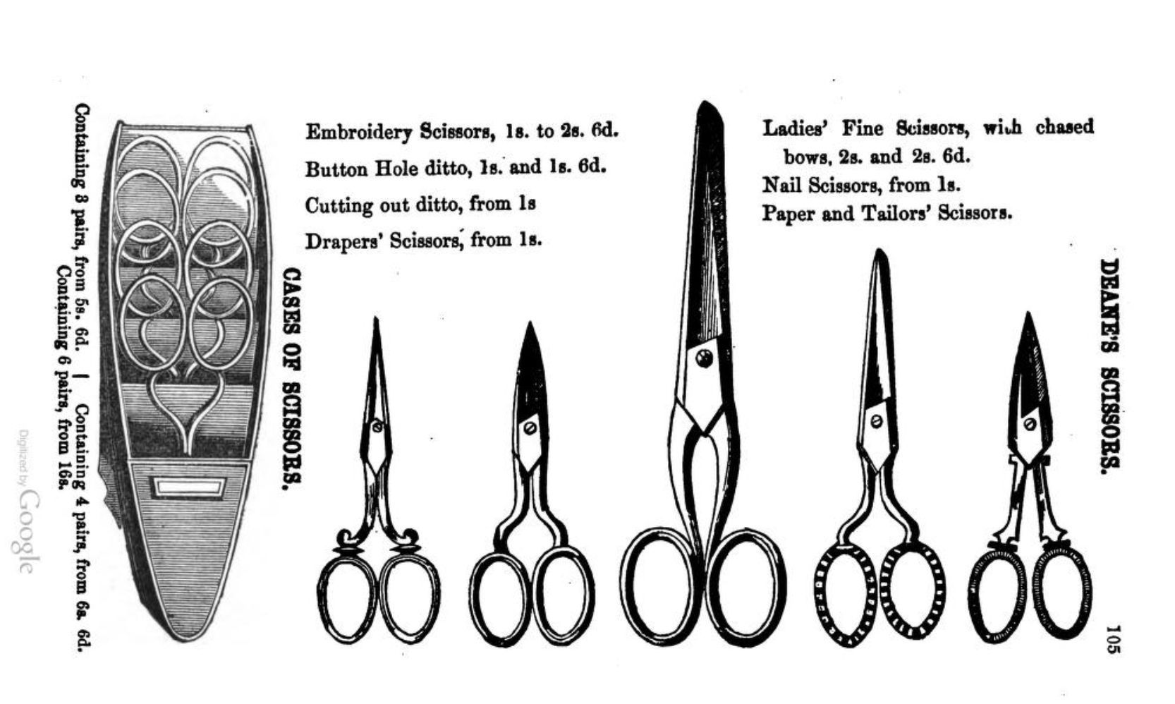 An image of a page illustrating pairs of scissors, including: a Case of Scissors; Embroidery Scissors; Button Hole Scissors; Cutting Out Scissors; Ladies' Fine Scissors with chased bows; and Nail Scissors. Also listed but not illustrated are Drapers' Scissors, and Paper and Tailors' Scissors.