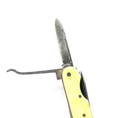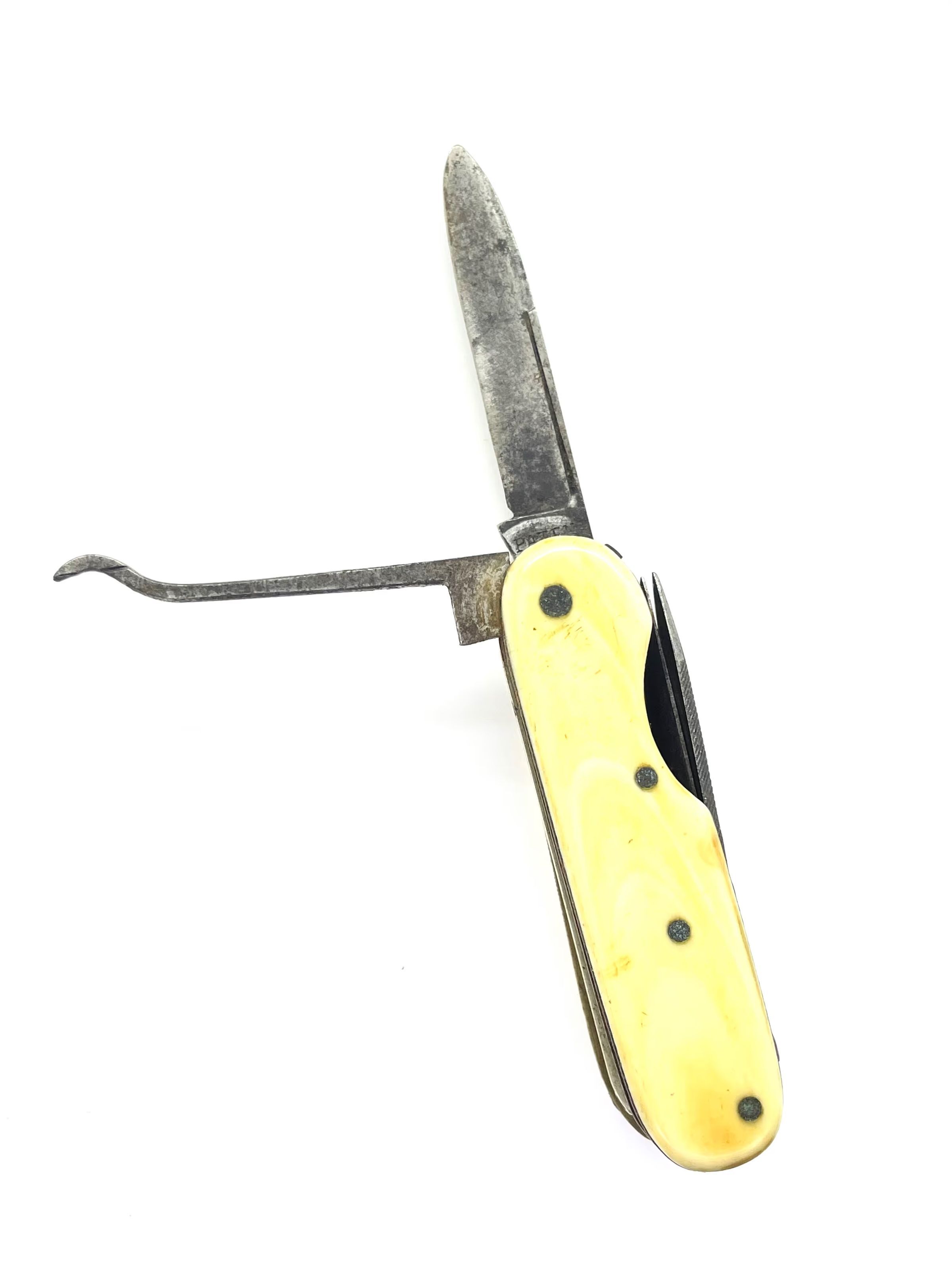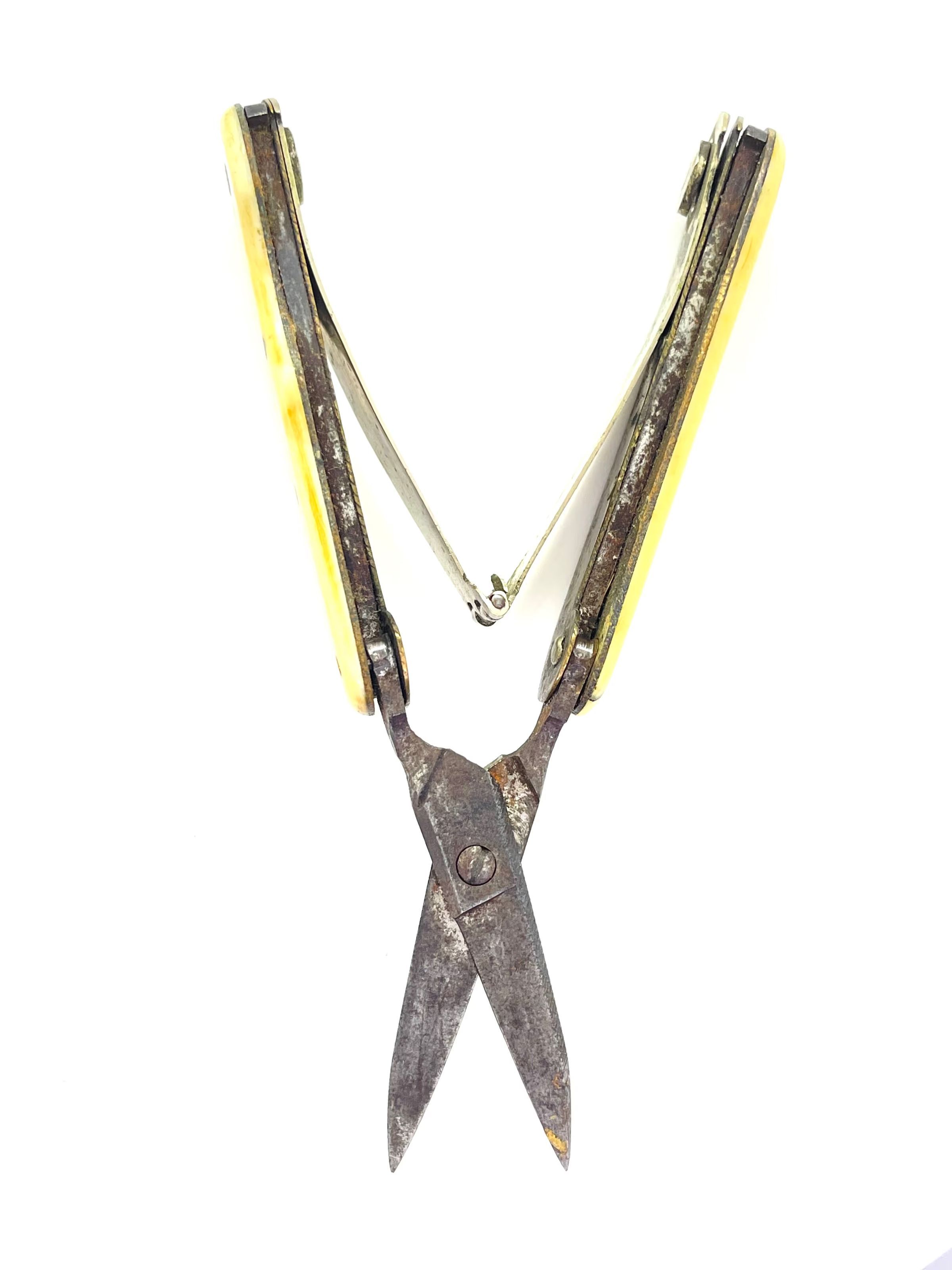 A folding set comprising scissors, knife blade, and button hook. Blade is leaf point, shoulder is st1/st3 (square, but with a slight backwards profile), cross section is cs4. The edges of both scissor blades have been scored to form files. The base of the knife blade is marked PATENT.Category