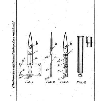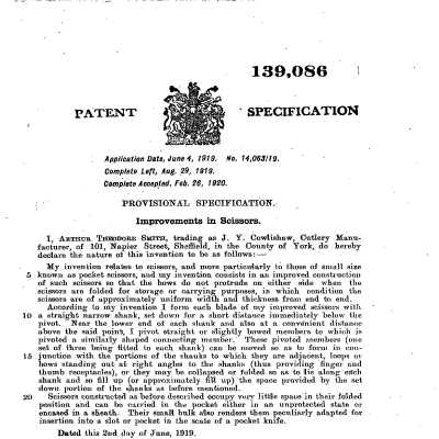A pair of scissors with a folding handle design which was patented in 1919 (no. 139086) by Arthur Smith trading as J.Y. Cowlishaw. The bows fold away flat to the shanks so that they "do not protrude on either side when the scissors are folded for storage or carrying purposes, in which condition the scissors are of approximately uniform width and thickness from end to end." (ref: patent document).
