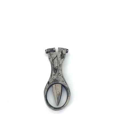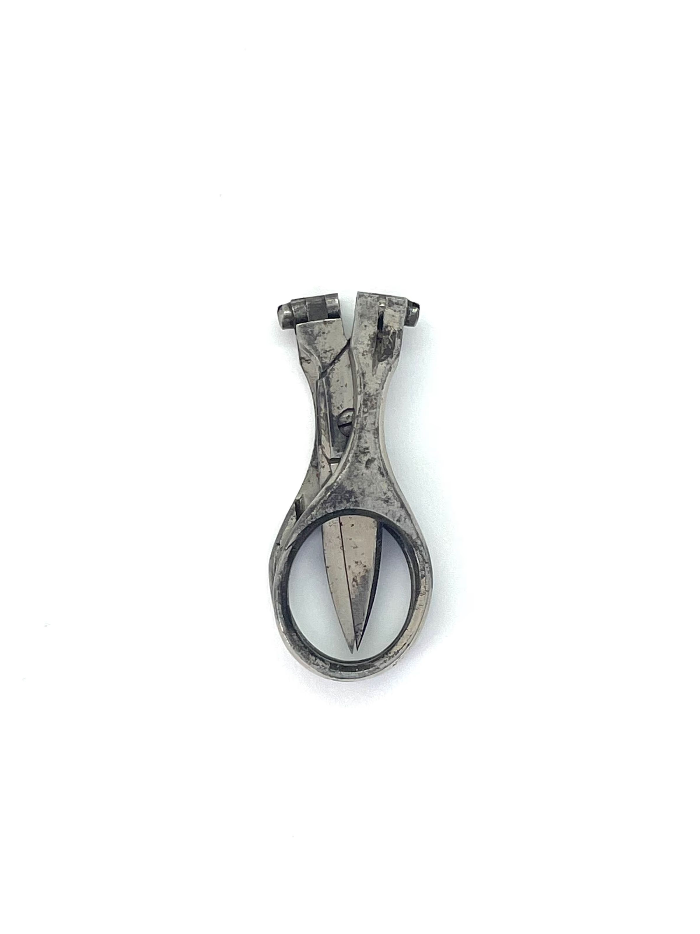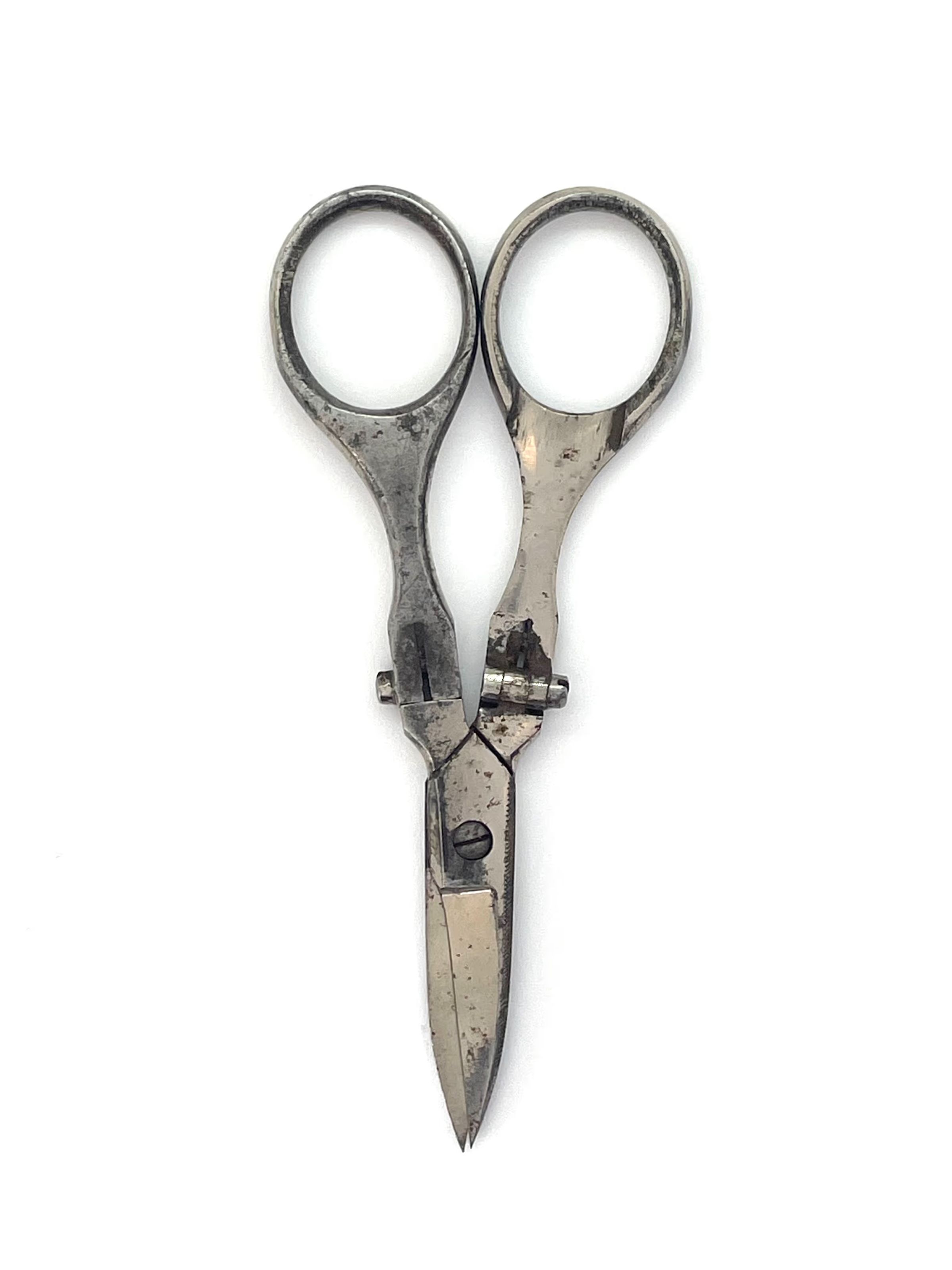 A pair of folding scissors where the each shank folds across a hinge. The outer portion of each blade forms a nail file. Pivot is a screw, shoulder is st1. Cross section in cs4 and the blade is leaf. There are no markings; stylistically dated to around 1950.Category