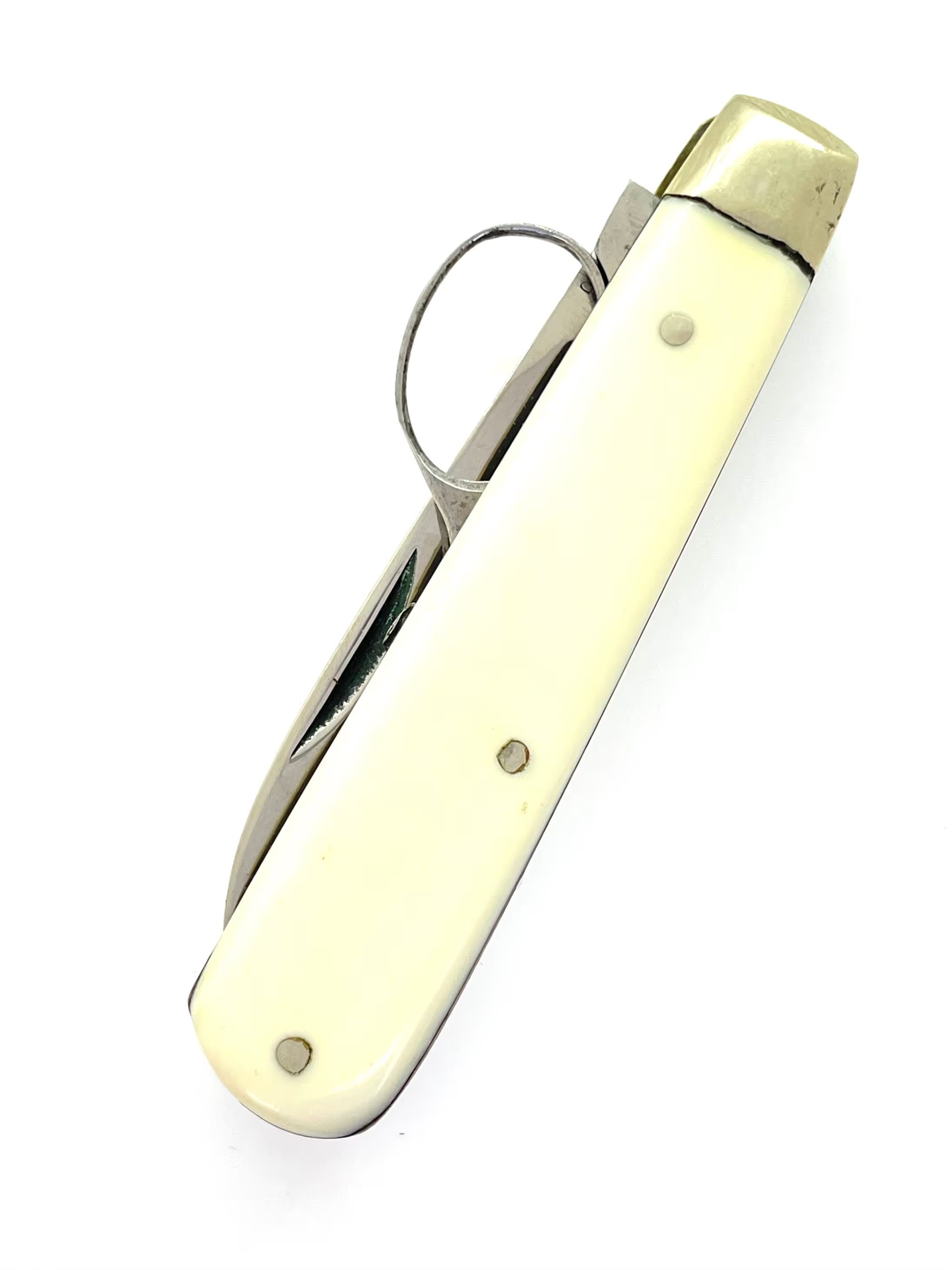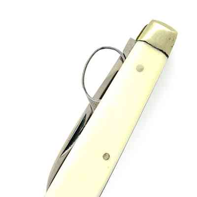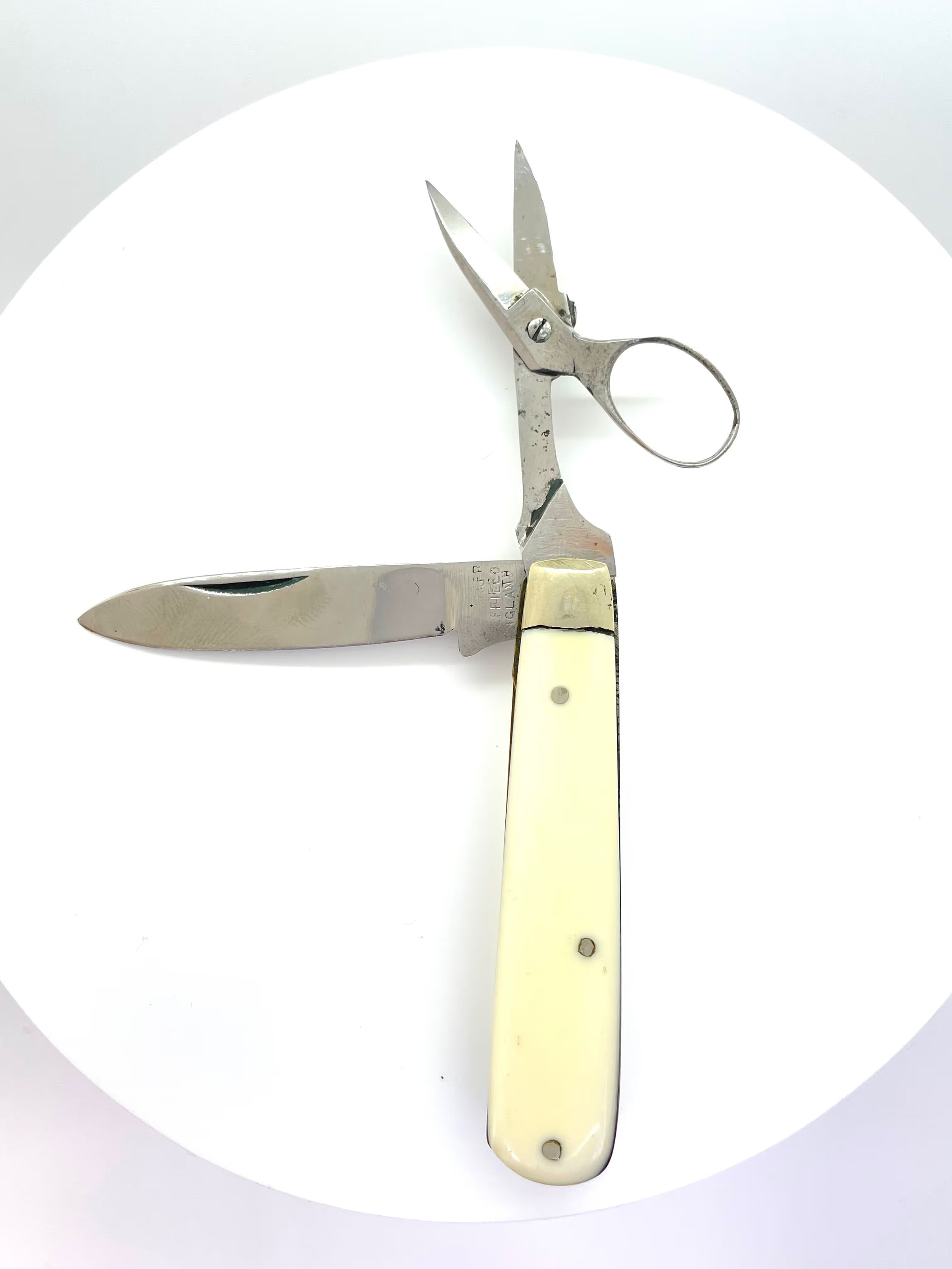 A folding blade with unsprung scissors. Marked "ENGLAND" on one side of the knife blade and "[...]EFFIELD [...]NGLAND" on the other. The pivot type on the scissors is a screw; scissor blade is leaf point, shoulder is st1 and cross section is cs8.Category