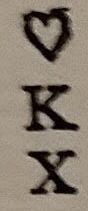 Gales & Martin (1787) has two entries for common scissor manufacturers names George Beal: George Junior and George Senior. Both are recorded as working at Bradfield (a village on the outskirts of Sheffield, approximately five miles from the current city centre). The maker's mark for George Senior consists of three elements stacked horizontally, from top to bottom: the outline of a heart; the letter "K"; and the letter "X". George Junior's mark consists of a cross above the letters "PUE".