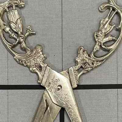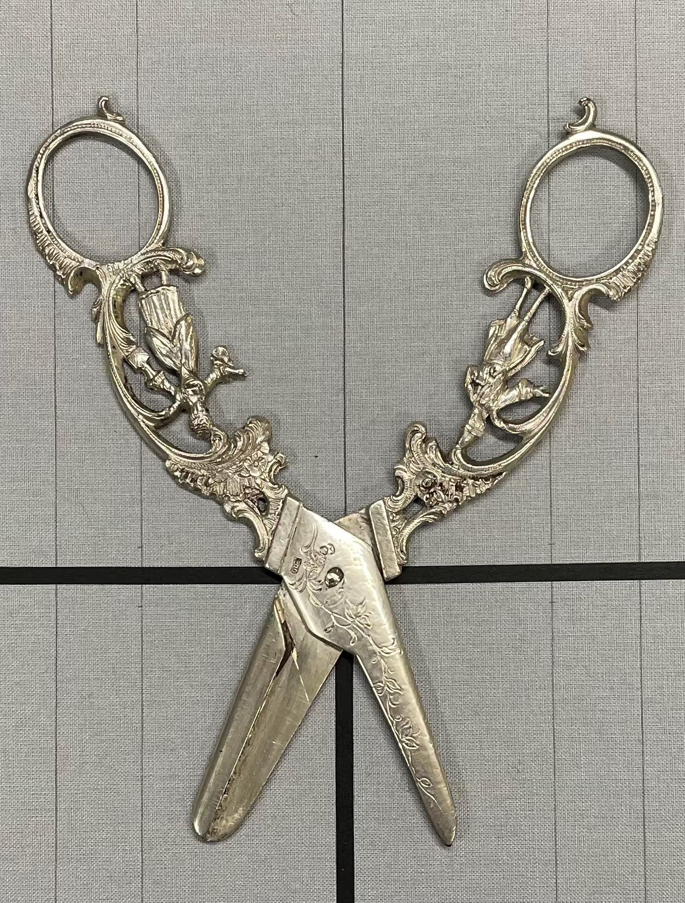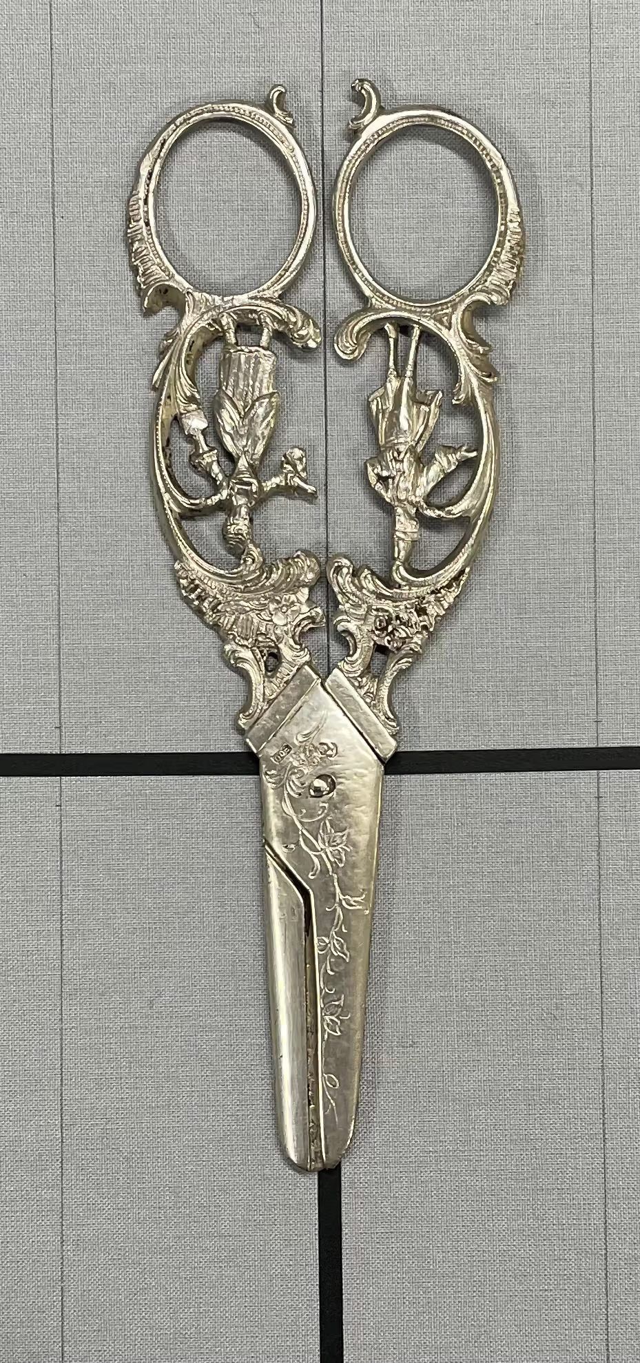 1800s, carbon, germany, silver, rounded point, grape scissors, etchedDescription