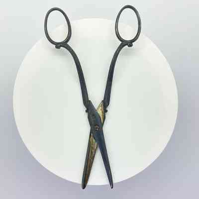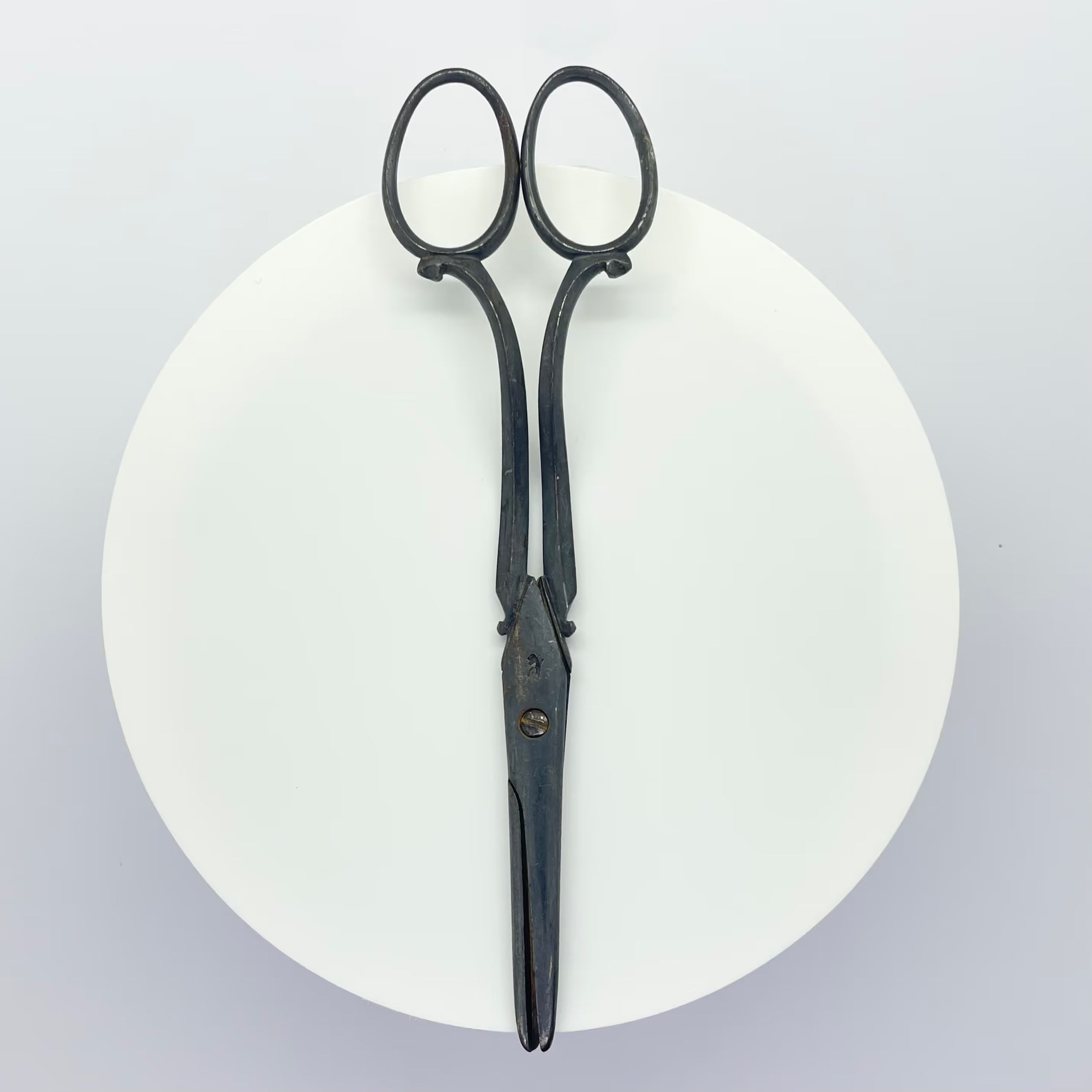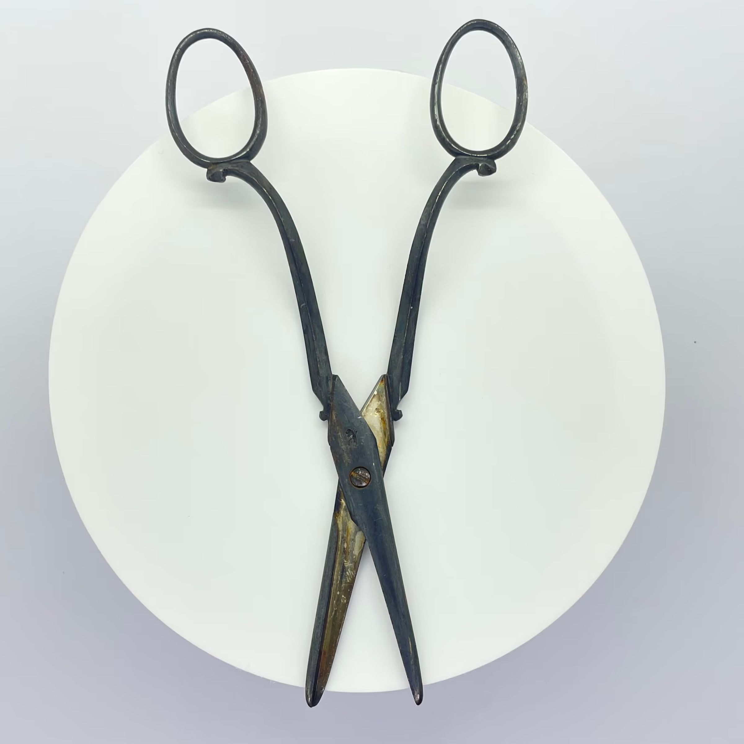 A pair of grape scissors with curved sarum shanks. A maker's mark is present on the pivot area, and there is a marking on one of the unders.Dimensions