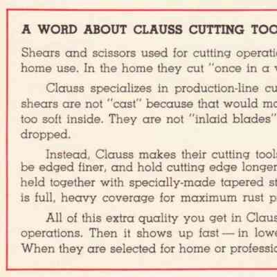 All of this extra quality you get in Clauss cutting tools is hidden - until they are put to work on production operations. Then it shows up fast - in lower maintenance costs ... more efficient cutting ... and longer tool life. When they are selected for home or professional use, these facts mean extra value."Publication Details