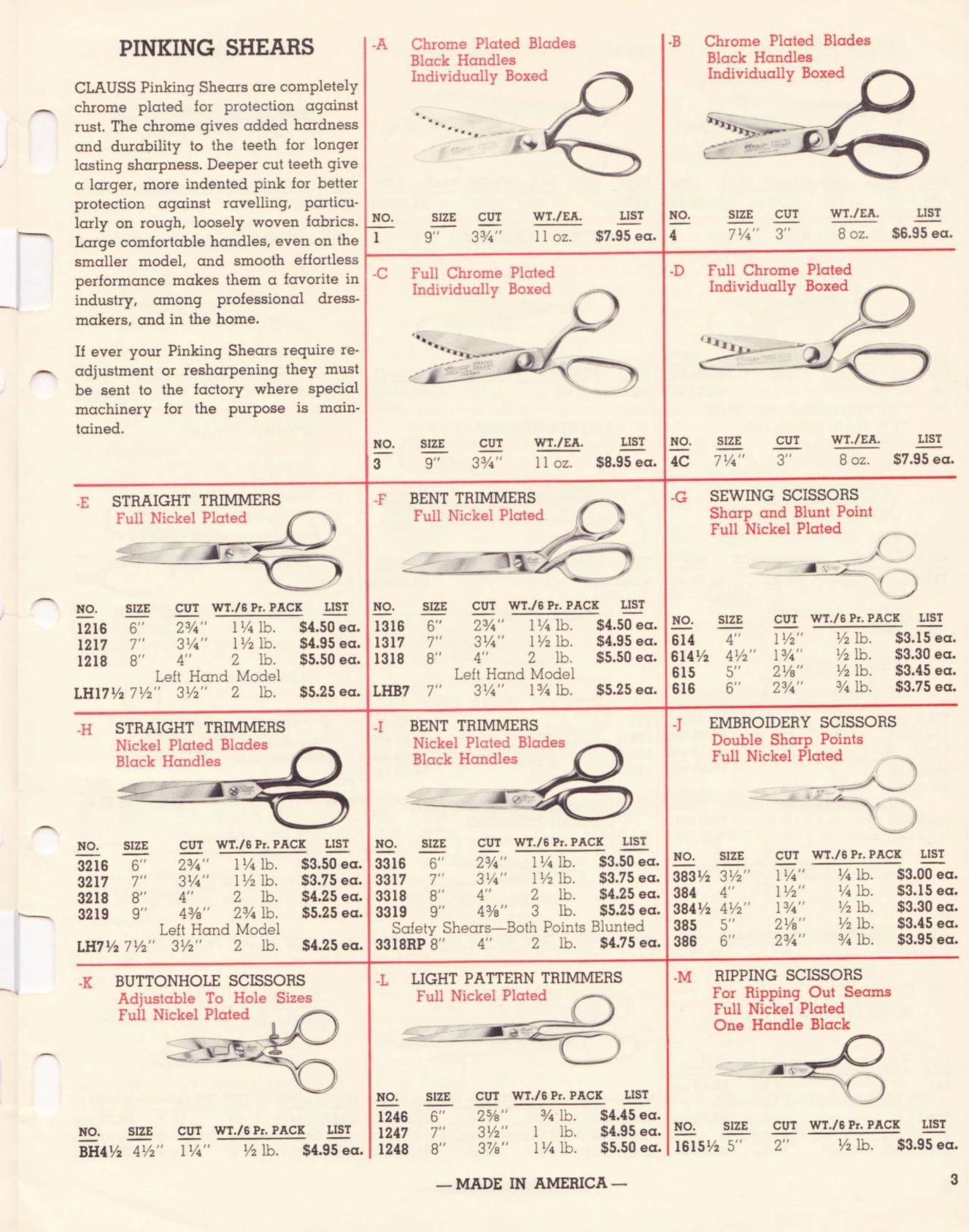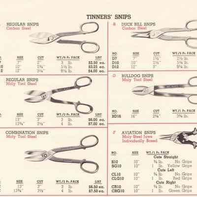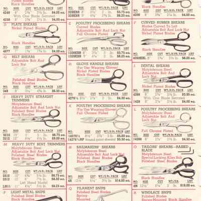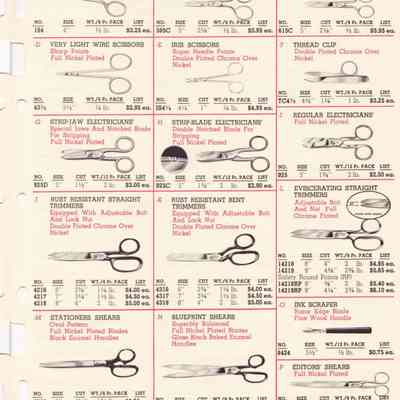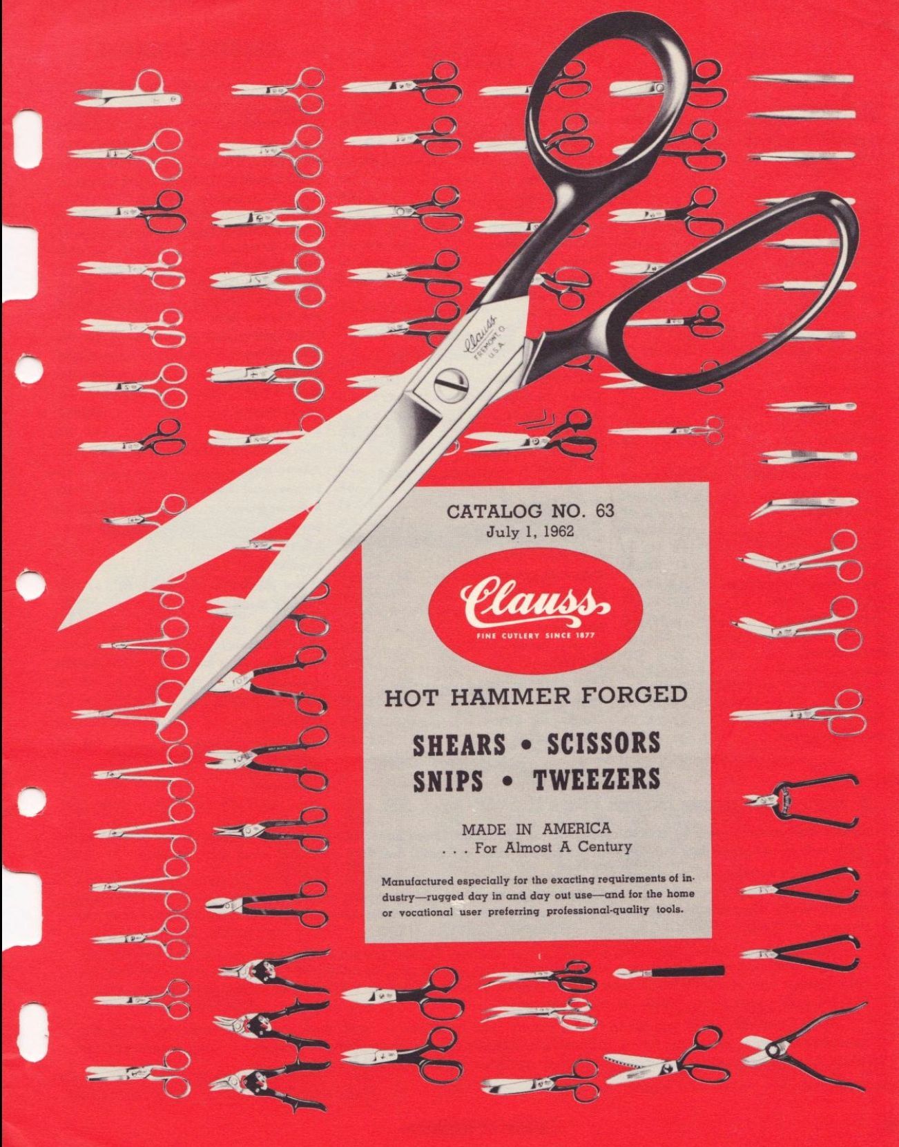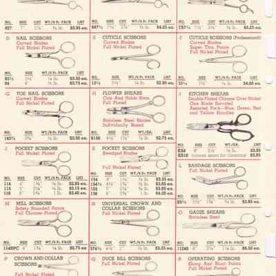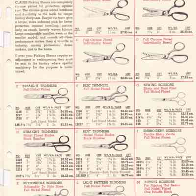 Clauss were American manufacturers of scissors, shears, and snips. Their 1962 Catalogue of Hot Hammer Forged products illustrates a range of items, including:
