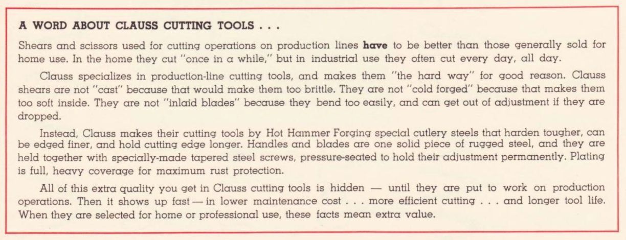 "Clauss specialises in production-line cutting tools, and makes them "the hard way" for good reason. Clauss shears are not "cast" because that would make them too brittle. They are not "cold forged" because that makes them too soft inside. They are not "inlaid blades" because they bent too easily, and can get out of adjustment if they are dropped.