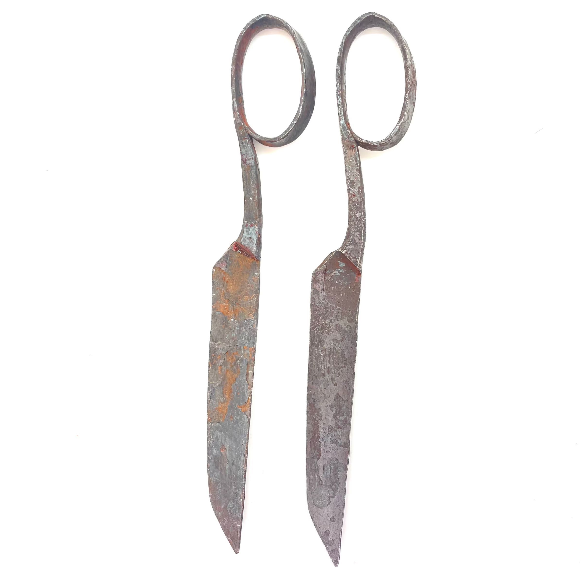 A large pair of hand forged scissors, dating from the first half of the 19th century. Holland (1831) describes the process for forming the bows as follows: