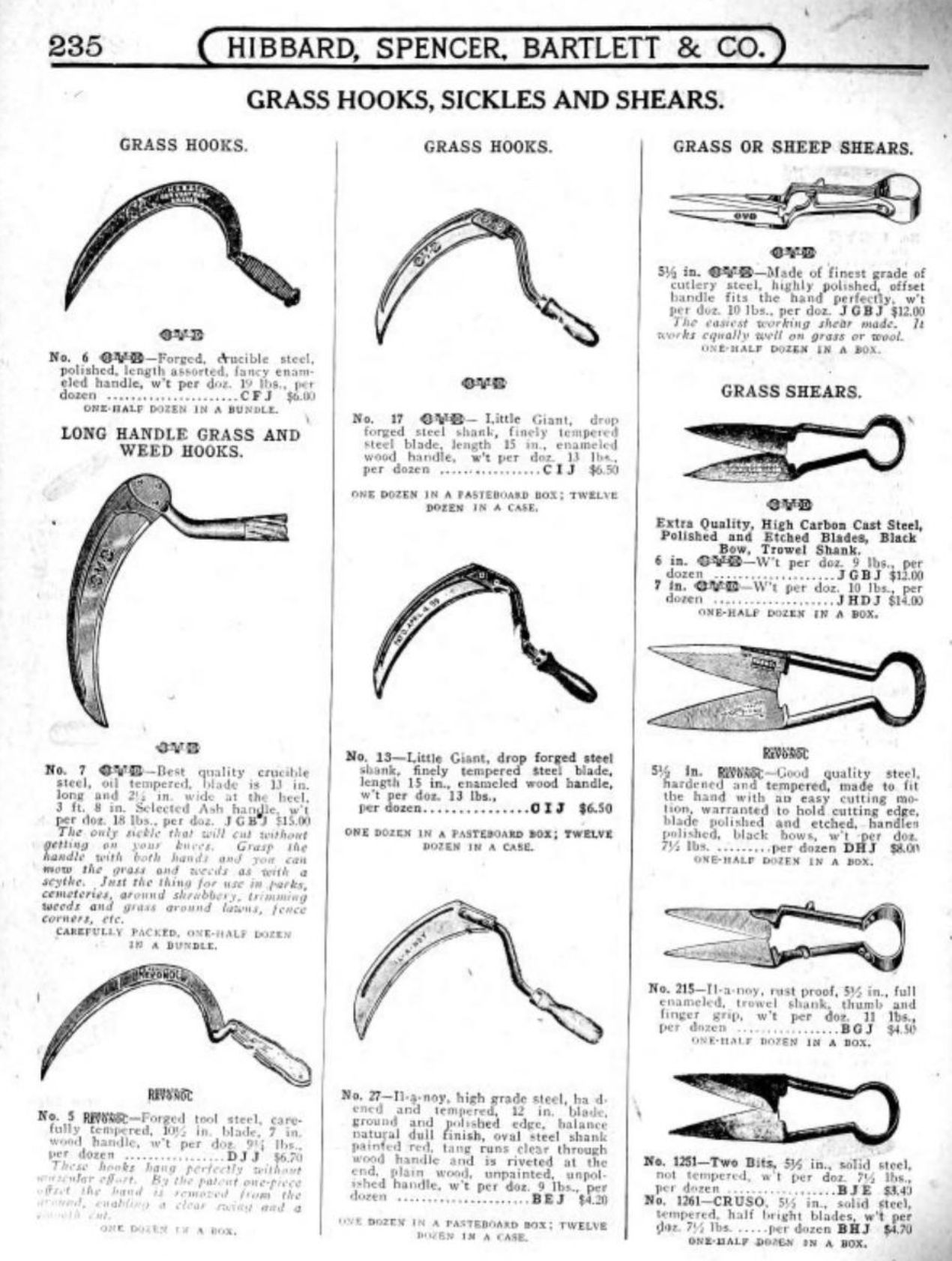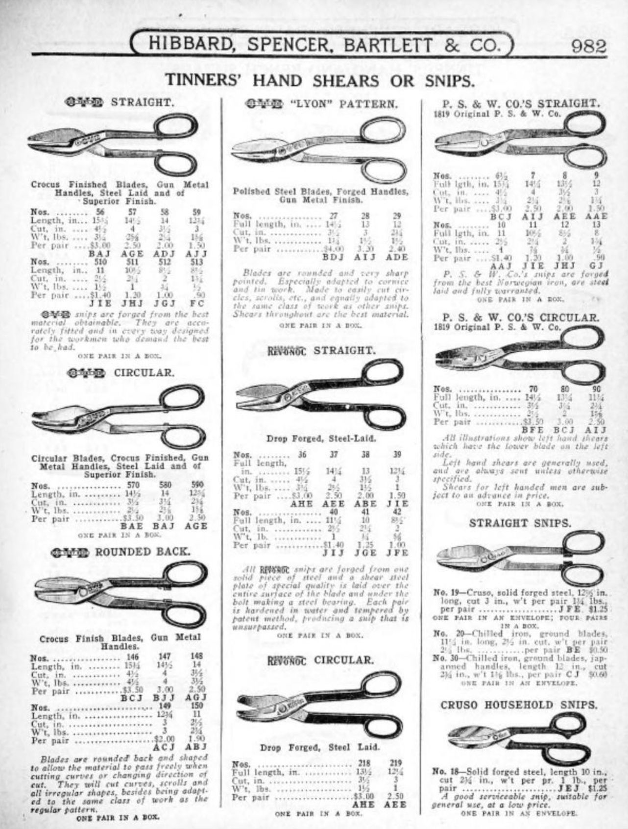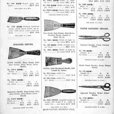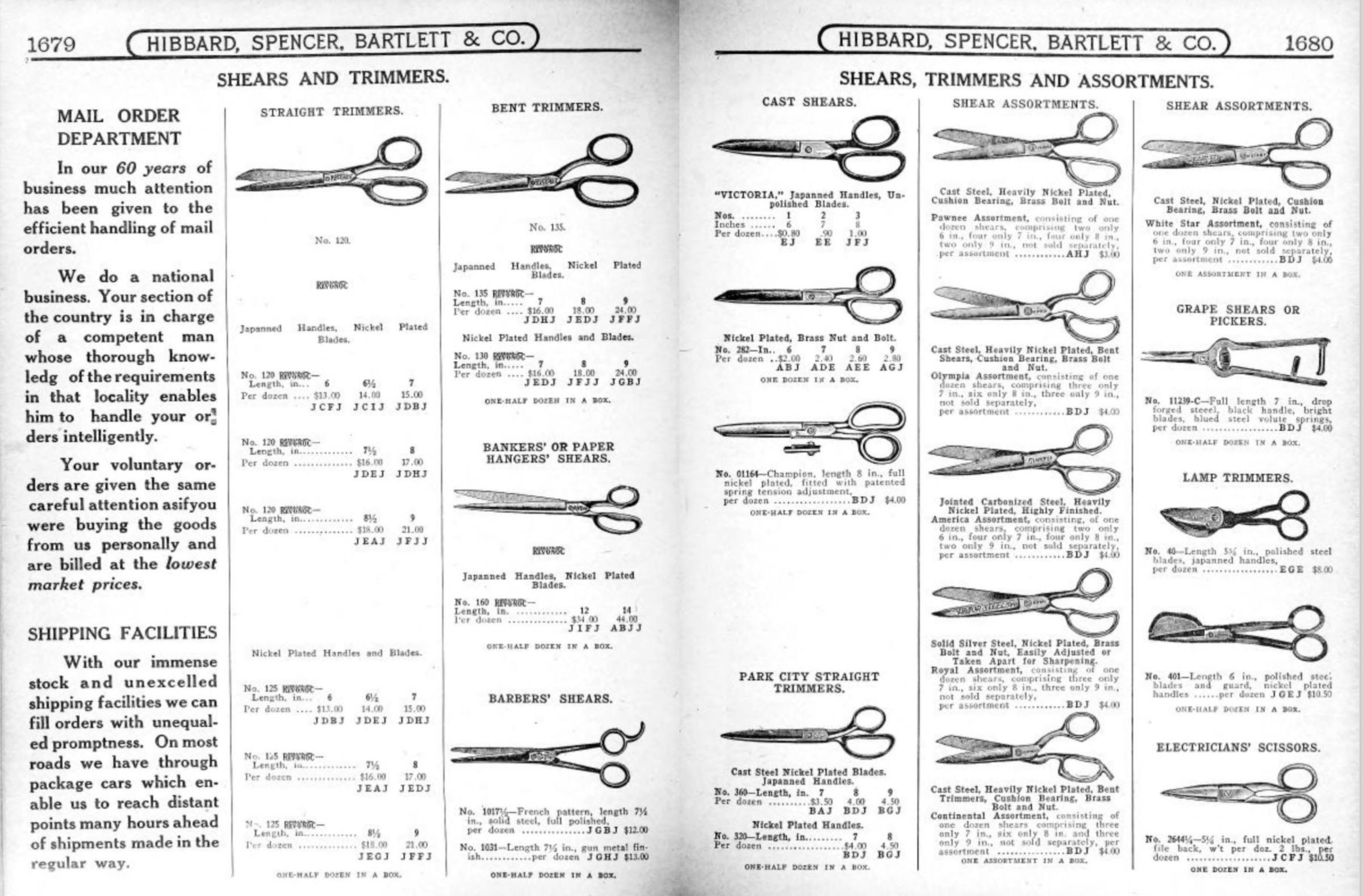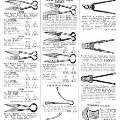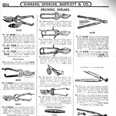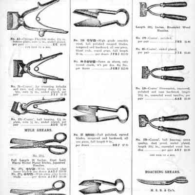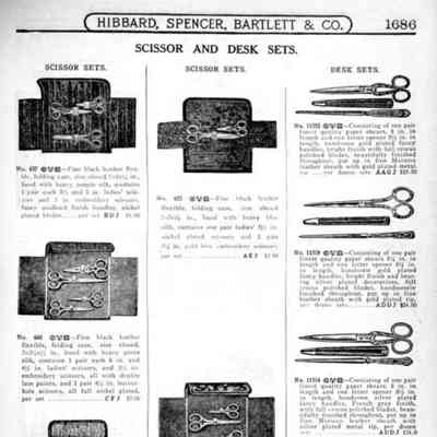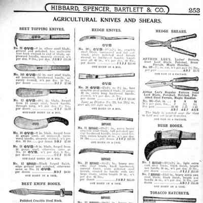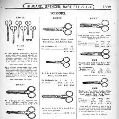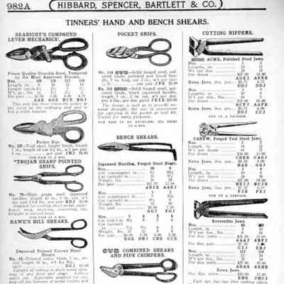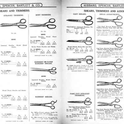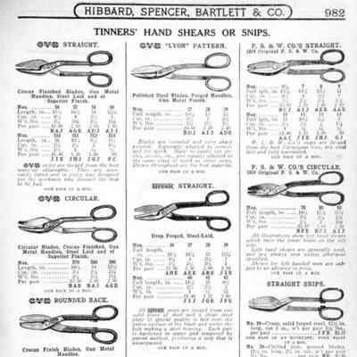 Hibbard, Spencer, Bartlett & Co. were suppliers of tools and hardware based in Chicago. Their 1916 Catalogue illustrates a range of scissors, shears, and snips, including: