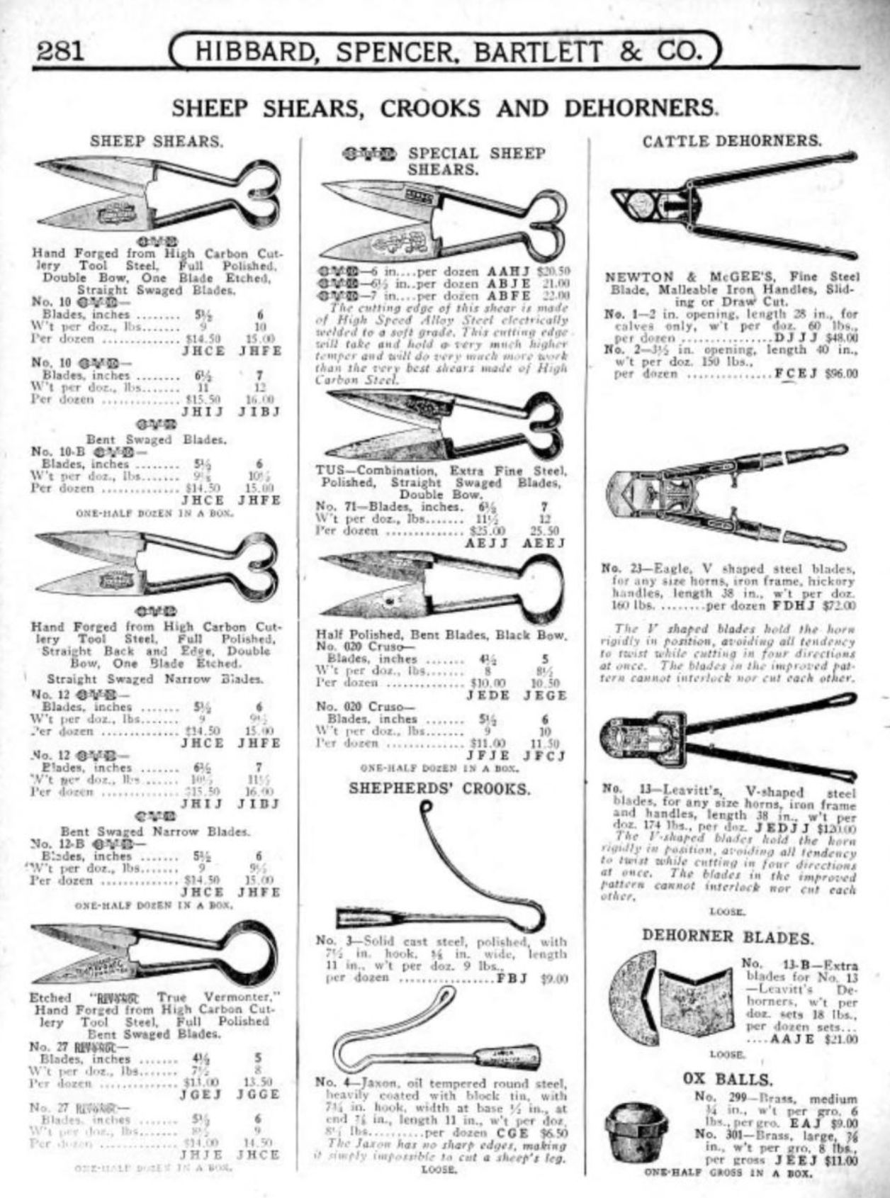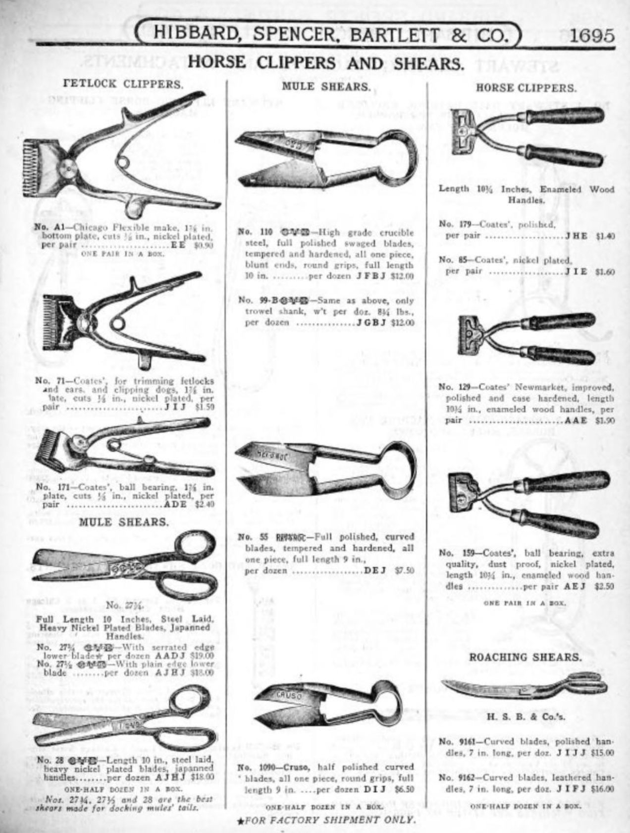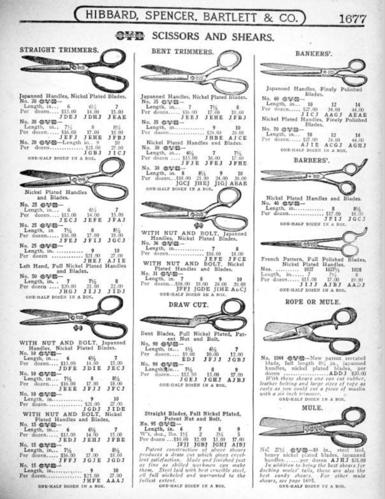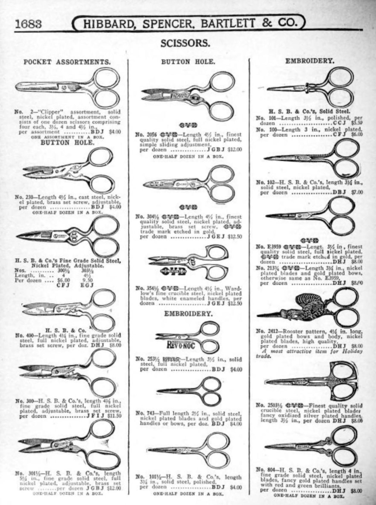Hibbard, Spencer, Bartlett & Co. were suppliers of tools and hardware based in Chicago. Their 1916 Catalogue illustrates a range of scissors, shears, and snips, including: