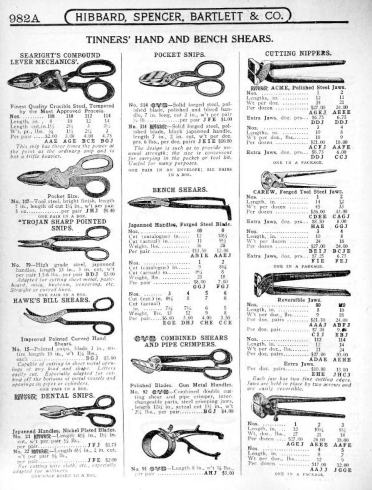 Tinners' Hand Shears and Snips - Straight, Circular, Rounded Back, Lyon Pattern, Household, Searight's Compound Lever Mechanics' Snips, Trojan Sharp Pointed Snips, Hawk's Bill Shears, Dental Snips, Pocket Snips, Bench Shears, Combined Shears and Pipe Crimpers