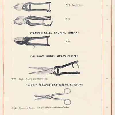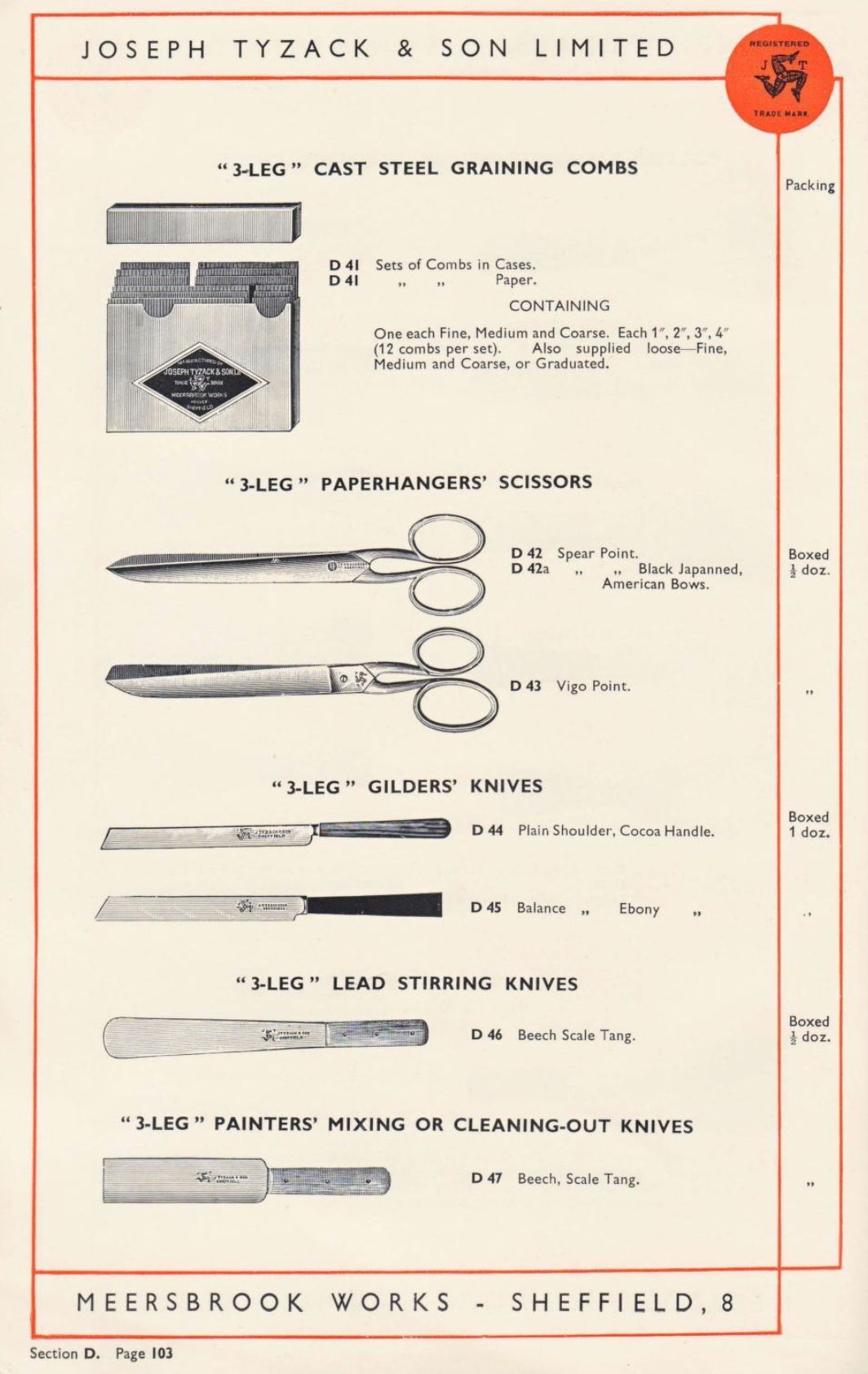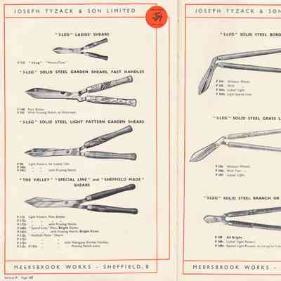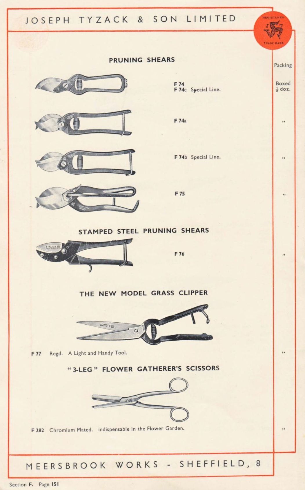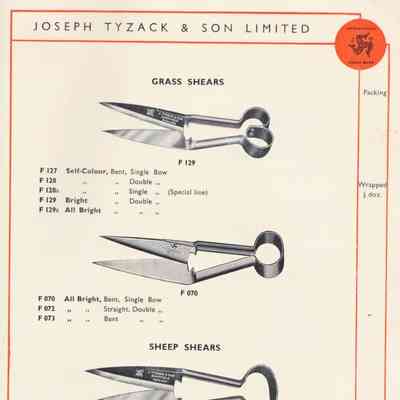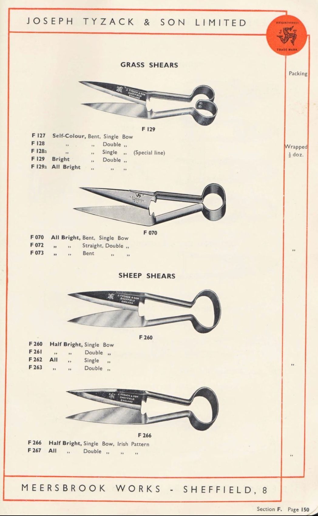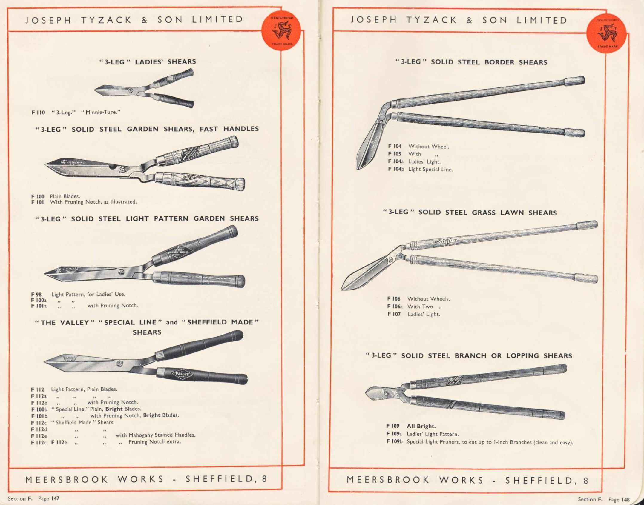 Joseph Tyzack & Son were a Sheffield based manufacturer, and holders of the "3-Leg" trademark. Their 1940 Catalogue illustrates a range of scissors and shears, including: