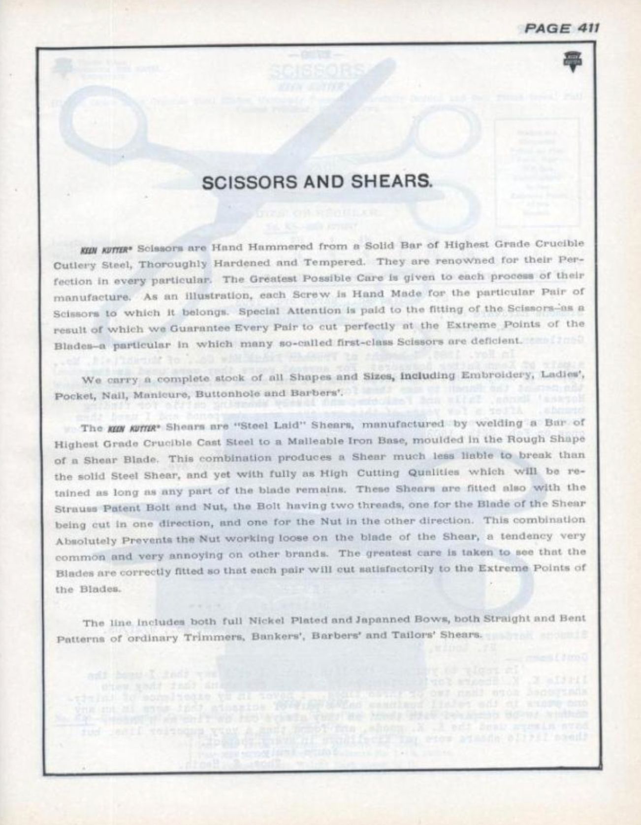 "The Keen Kutter Shears are "Steel Laid" Shears, manufactured by welding a Bar of Highest Grade Crucible Steel to a Malleable Iron Base, moulded in the Rough Shape of a Shear Blade. This combination produces a Shear much less liable to break than the solid Steel Shear, and yet with fully as High Cutting Qualities which will be retained as long as any part of the blade remains. These Shears are fitted also with the Strauss Patent Bolt and Nut, the Bolt having two threads one for the Blade of the Shear being cut in one direction, and one for the Nut in the other direction. This combination Absolutely Prevents the Nut working loose on the blade of the Shear, a tendency very common and very annoying on other brands. The greatest care is taken to see that the Blades are correctly fitted so that each pair will cut satisfactorily to the Extreme Points of the Blades.