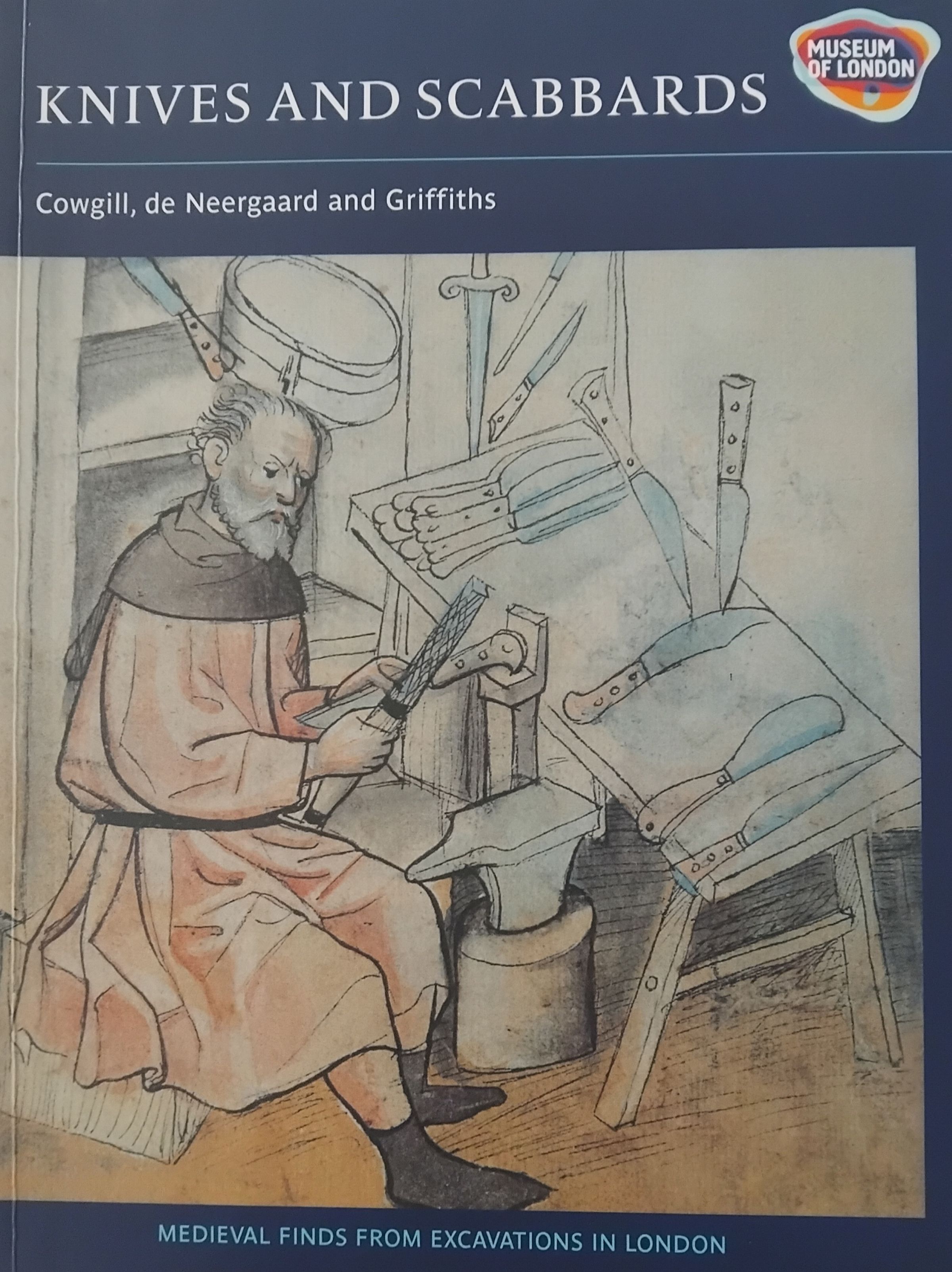 The artefacts discussed are mainly from six waterfront excavations of domestic rubbish dumps. The book gives an overview of manufacturing, the materials used, decorative elements, and makers' marks. Reference is made to supporting documentary evidence, particularly from the Guilds (with the cutlers' guild being "perhaps the most powerful, and certainly the best recorded"). Evidence again covers manufacture and makers' marks, as well as rules and regulations covering aspects such as sale of items laid out by various guilds and/or the monarch. The construction and decoration of scabbards is addressed, as are the potential uses of the knives, shears, and scissors (eg, table knives, cleavers, sheep shears, fullers' shears, etc).