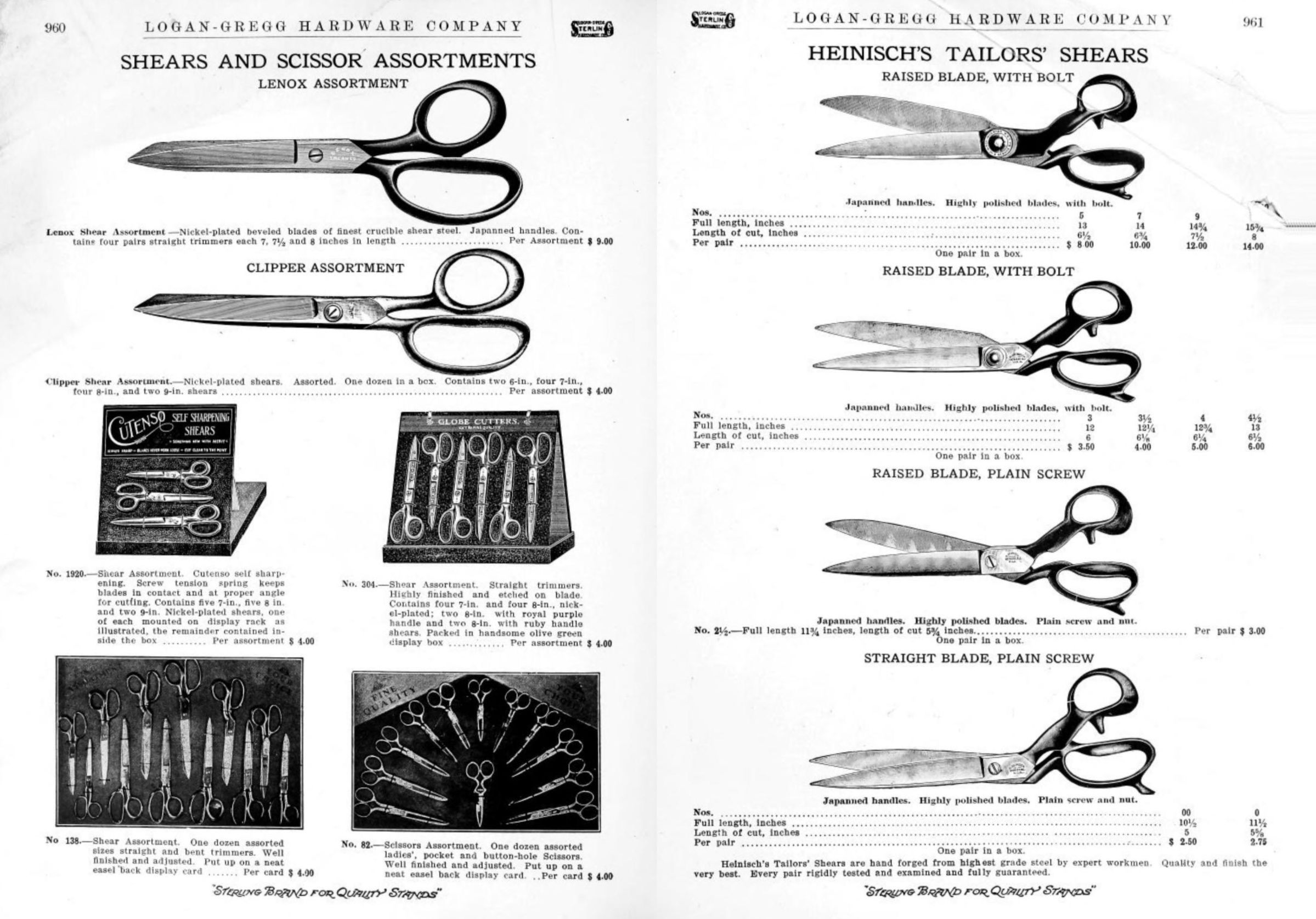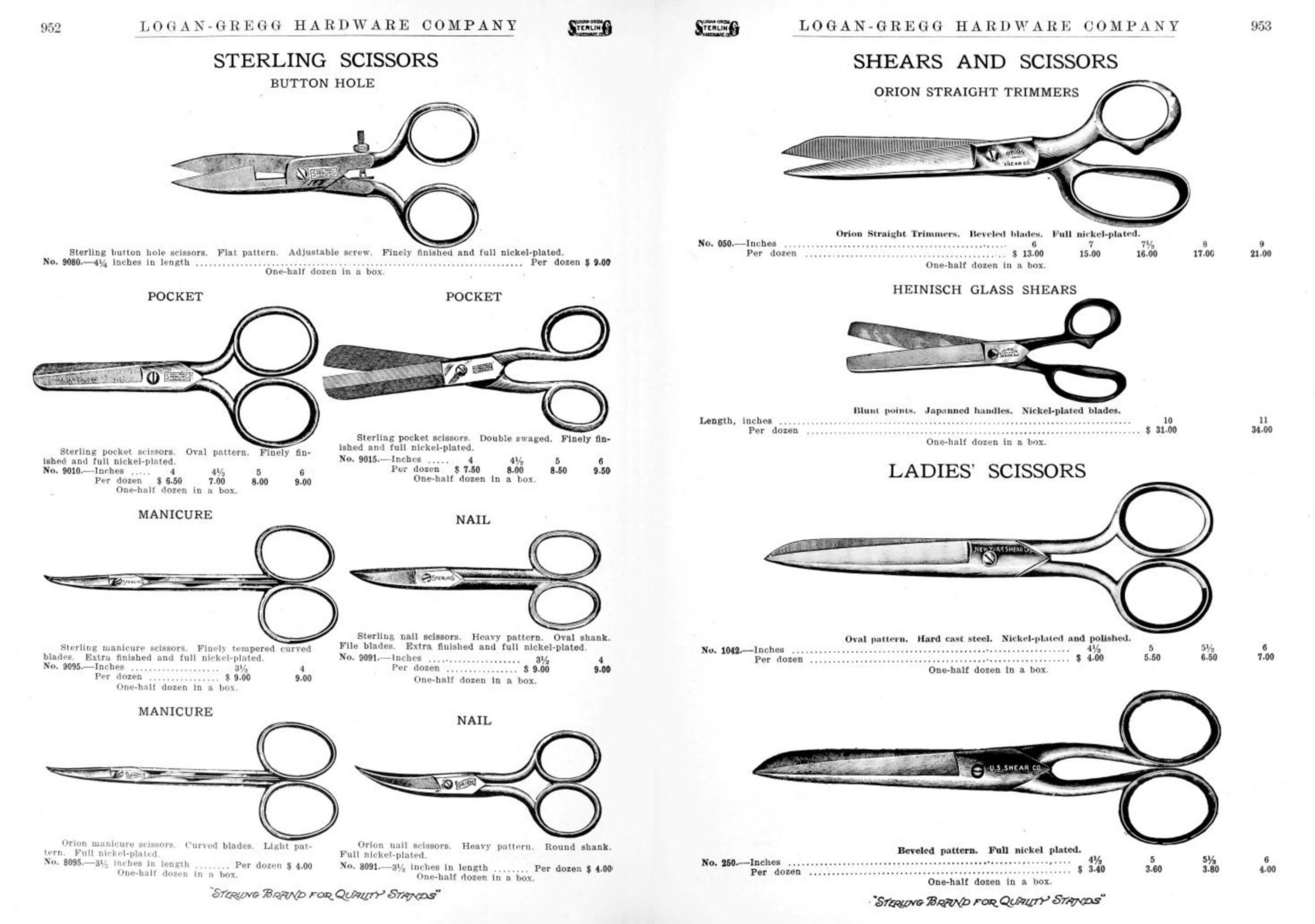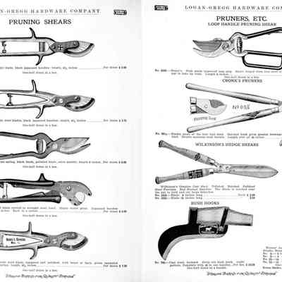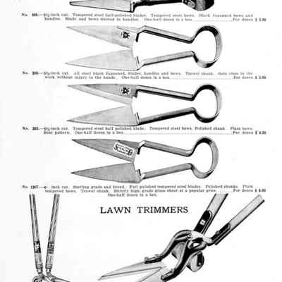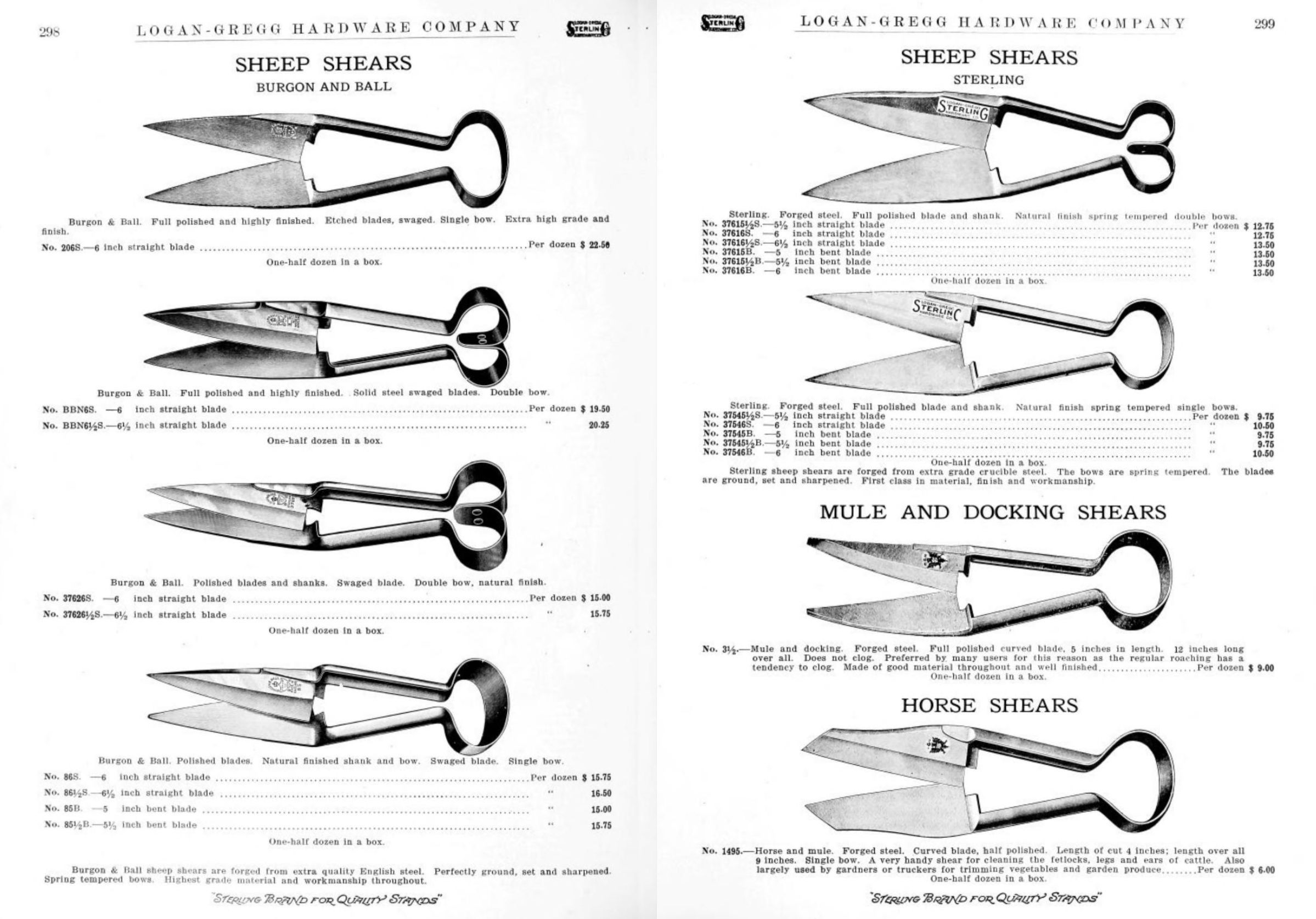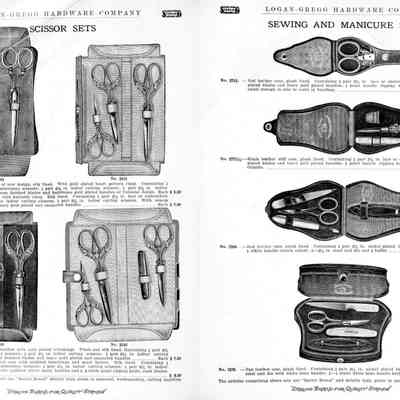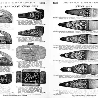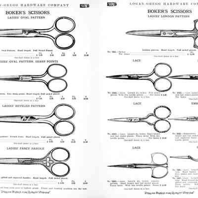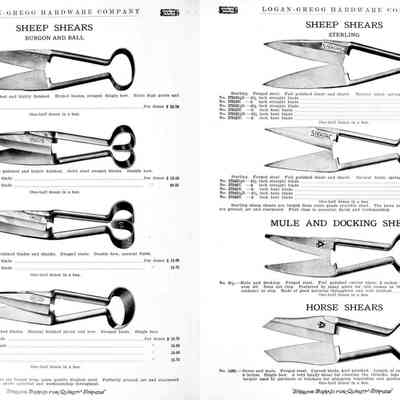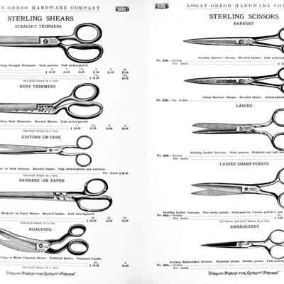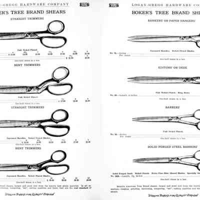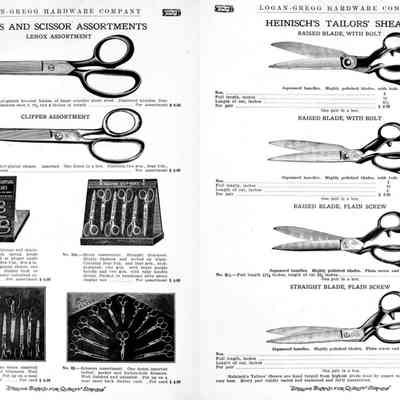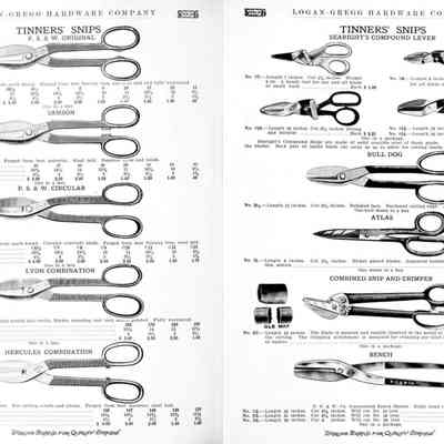 Logan-Gregg Hardware Company were wholesale distributors of tools and hardware. Their 1912 Catalogue illustrates a range of scissors, snips, and shears, including: