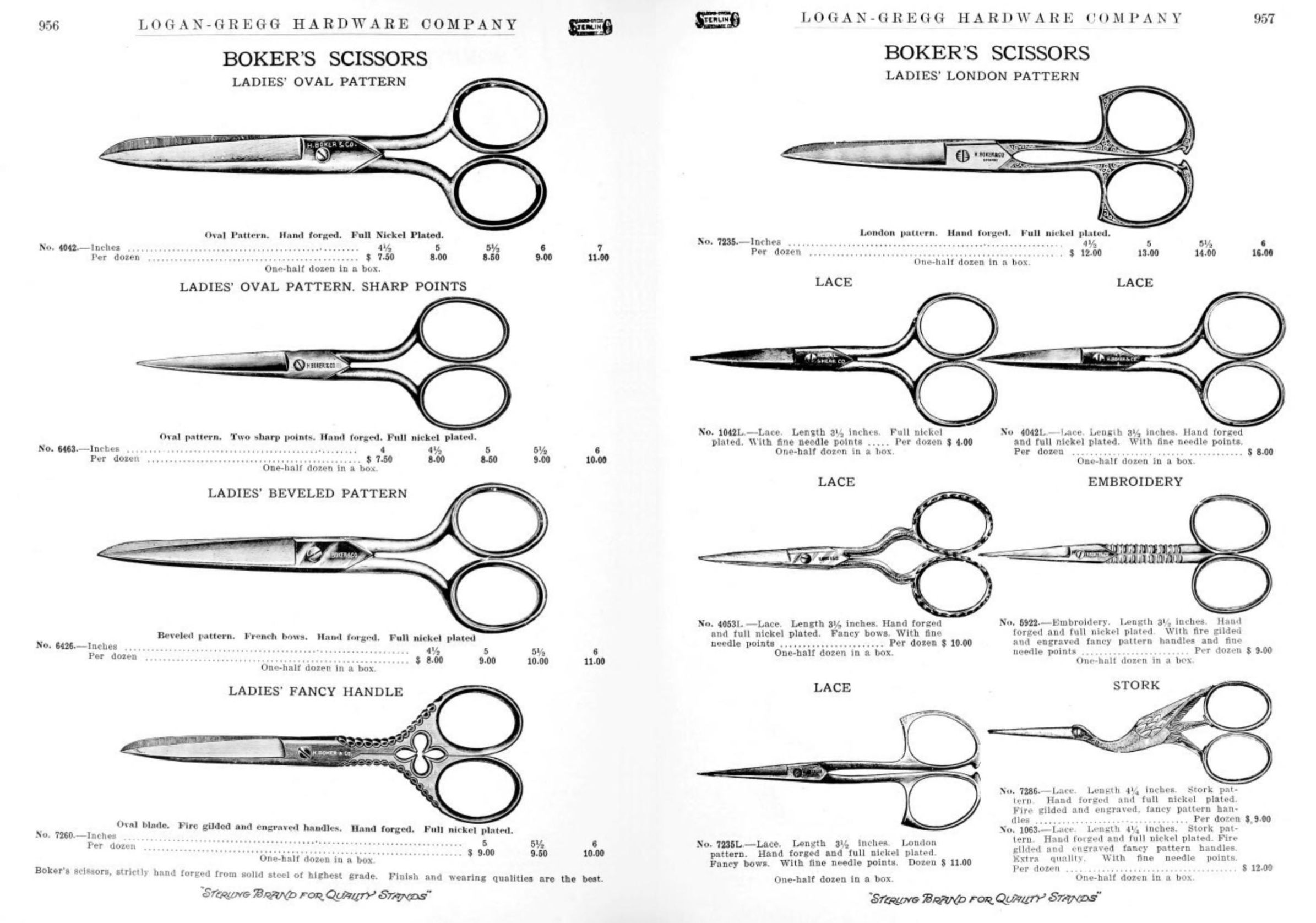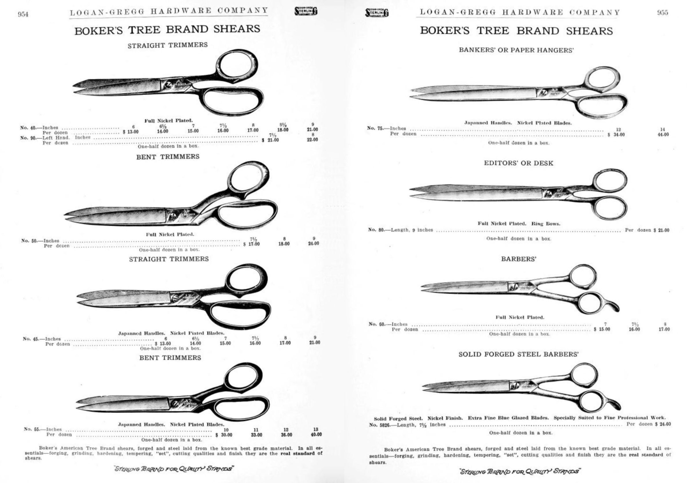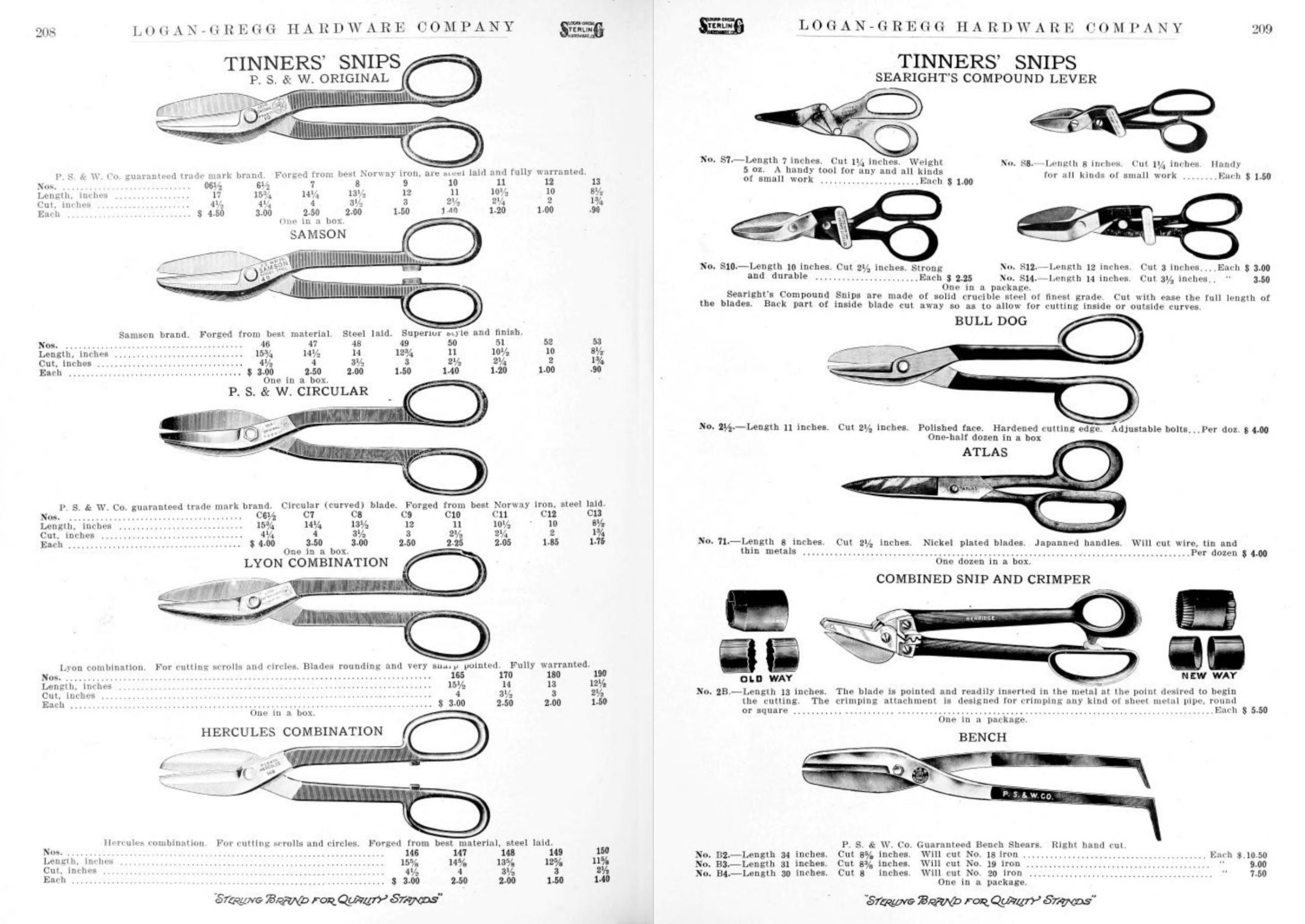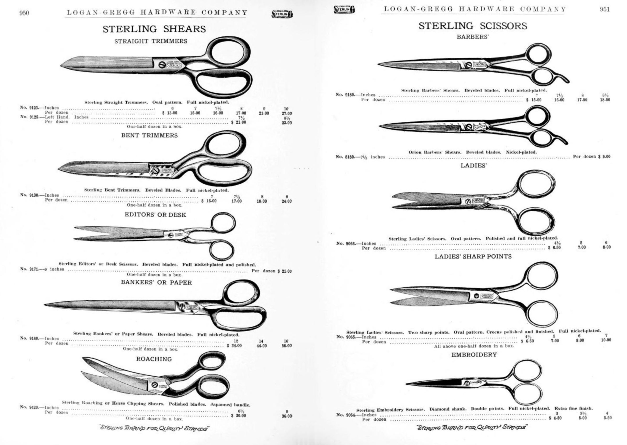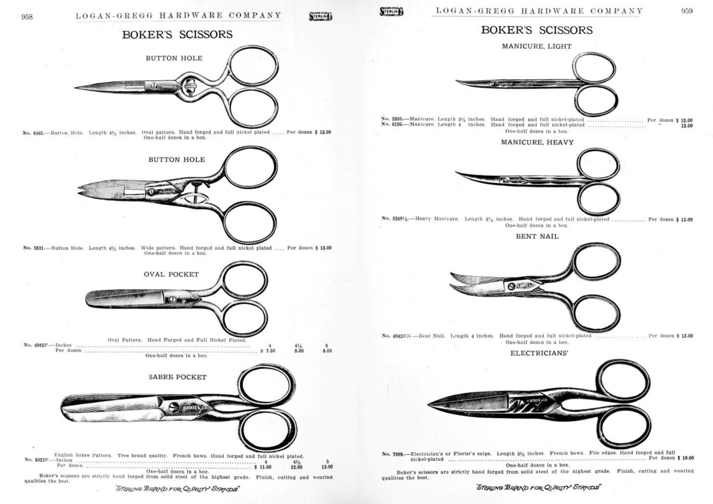 Logan-Gregg Hardware Company were wholesale distributors of tools and hardware. Their 1912 Catalogue illustrates a range of scissors, snips, and shears, including:
