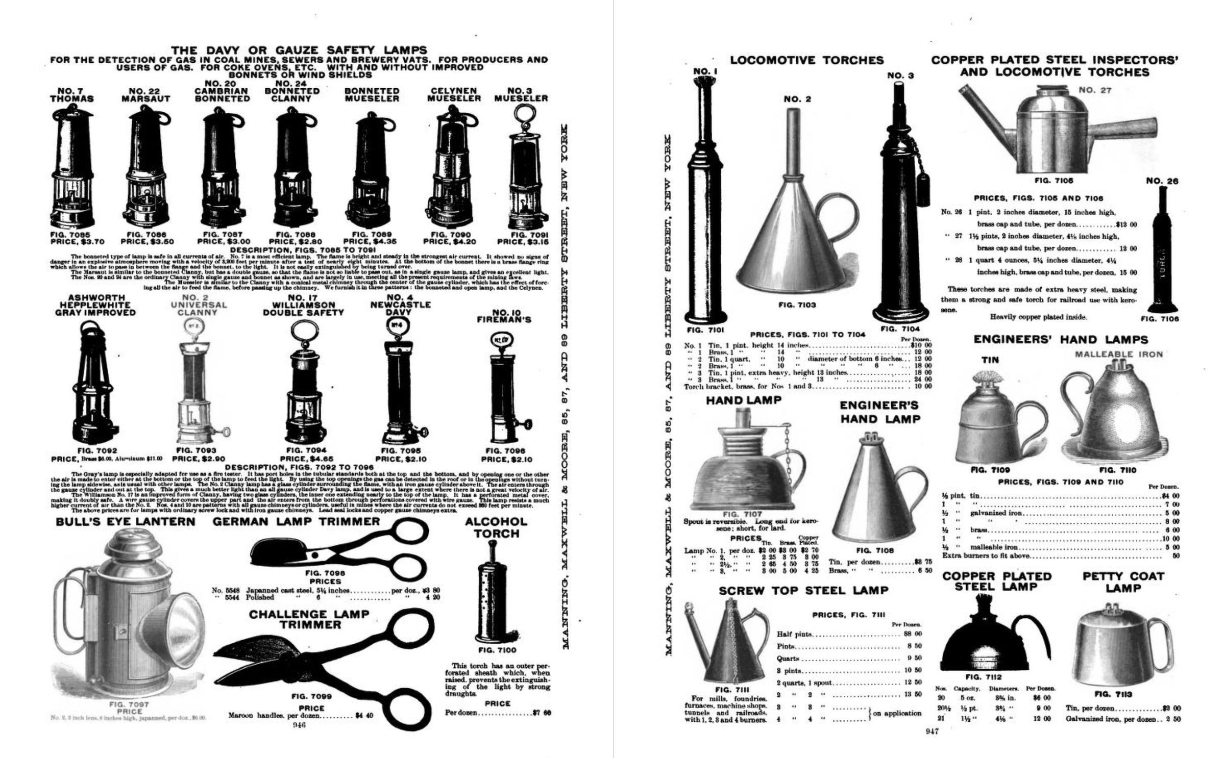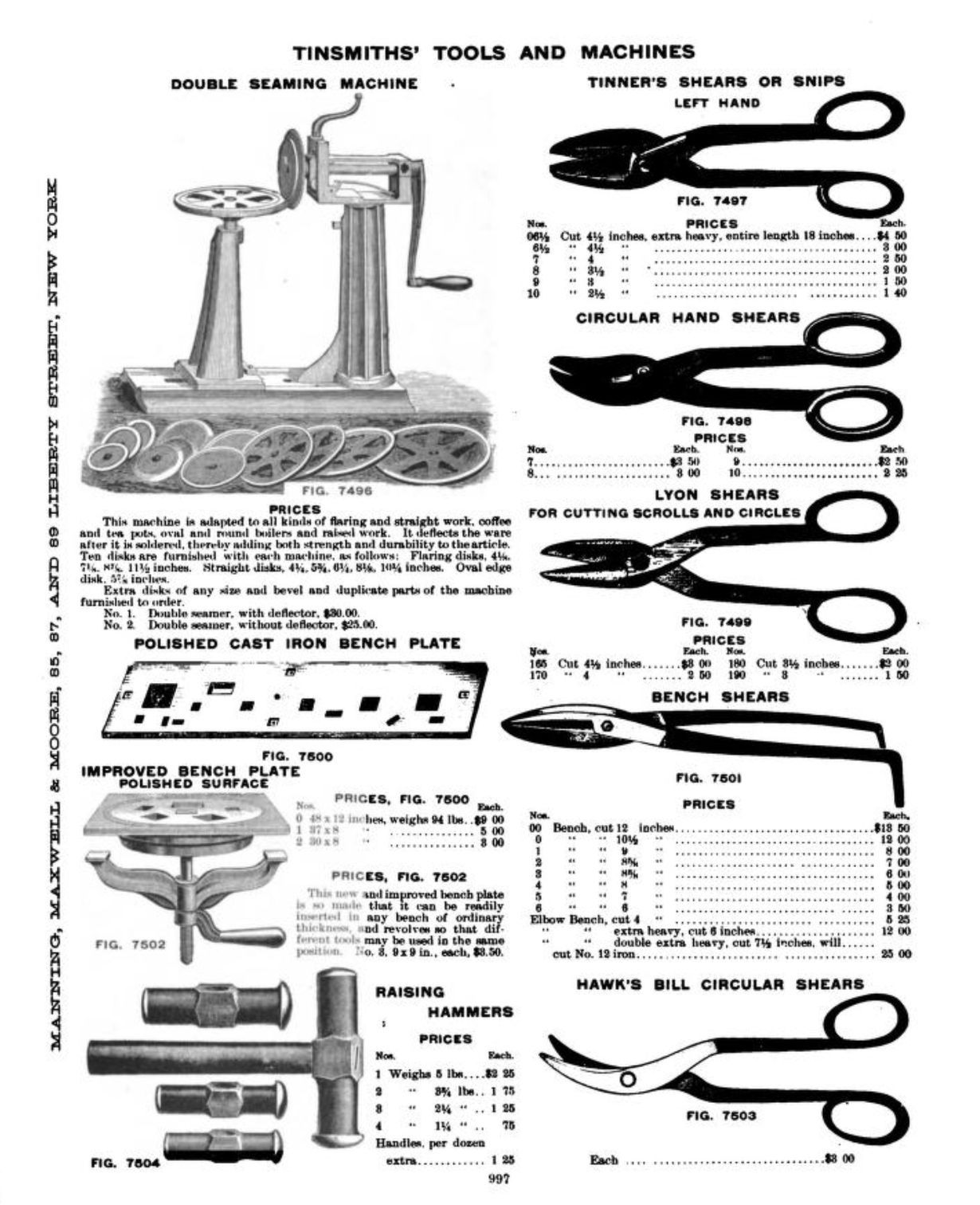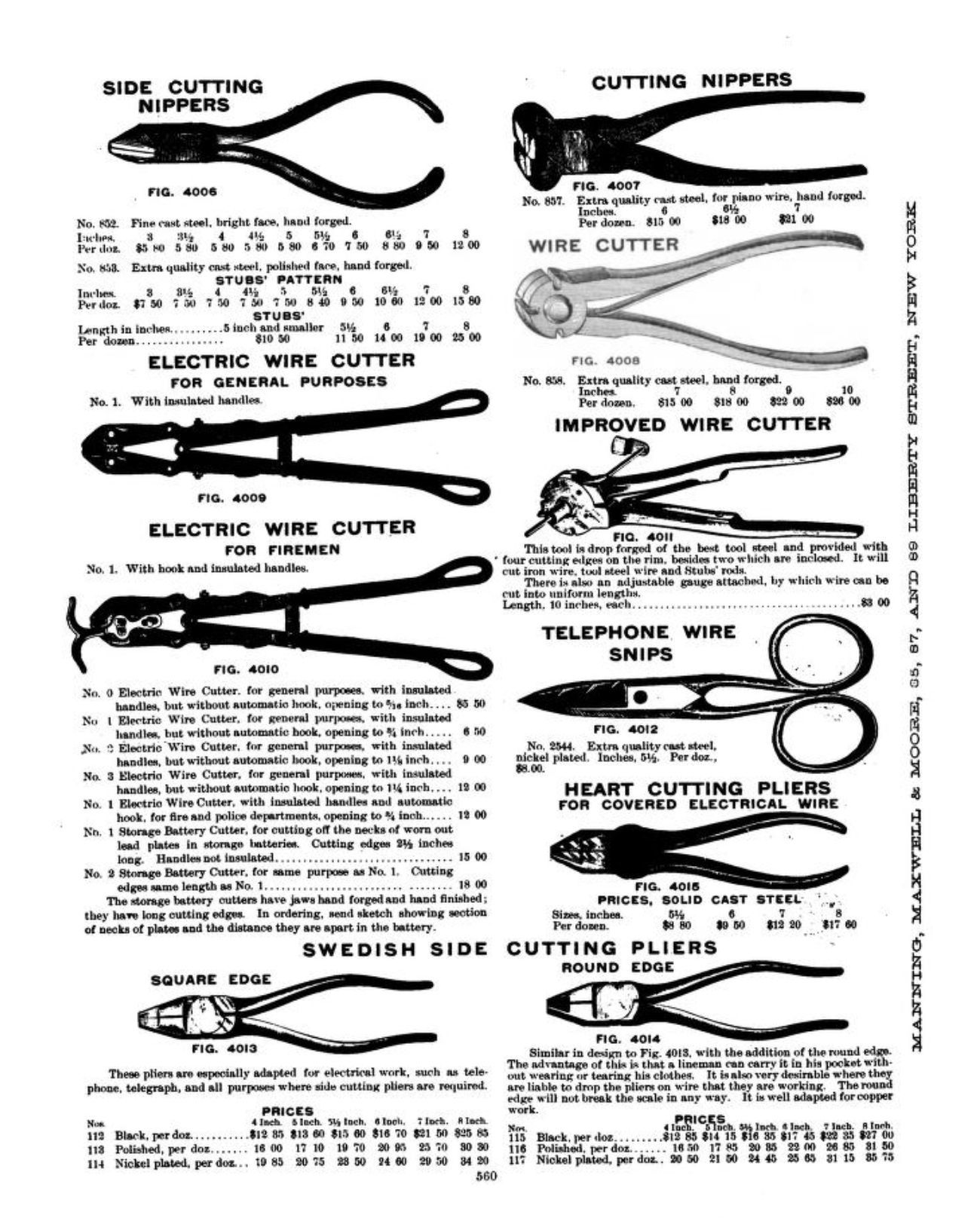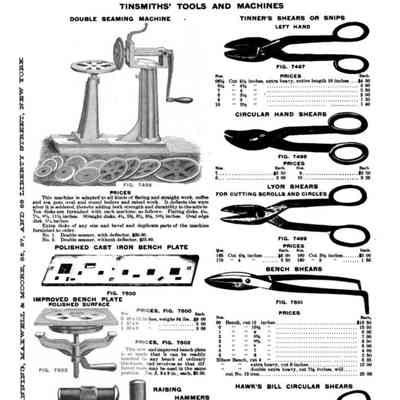 Manning, Maxwell & Moore were American suppliers of tools and hardware. Their 1902 Railway, Steamship, Machinist, Factory, Mill and Electric Supplies Catalogue illustrates a variety of scissors, shears, and snips, including: Telephone Wire Scissors; German Lamp Trimmers; Challenge Lamp Trimmers; and Tinsmith's Snips and Shears.Publication Details