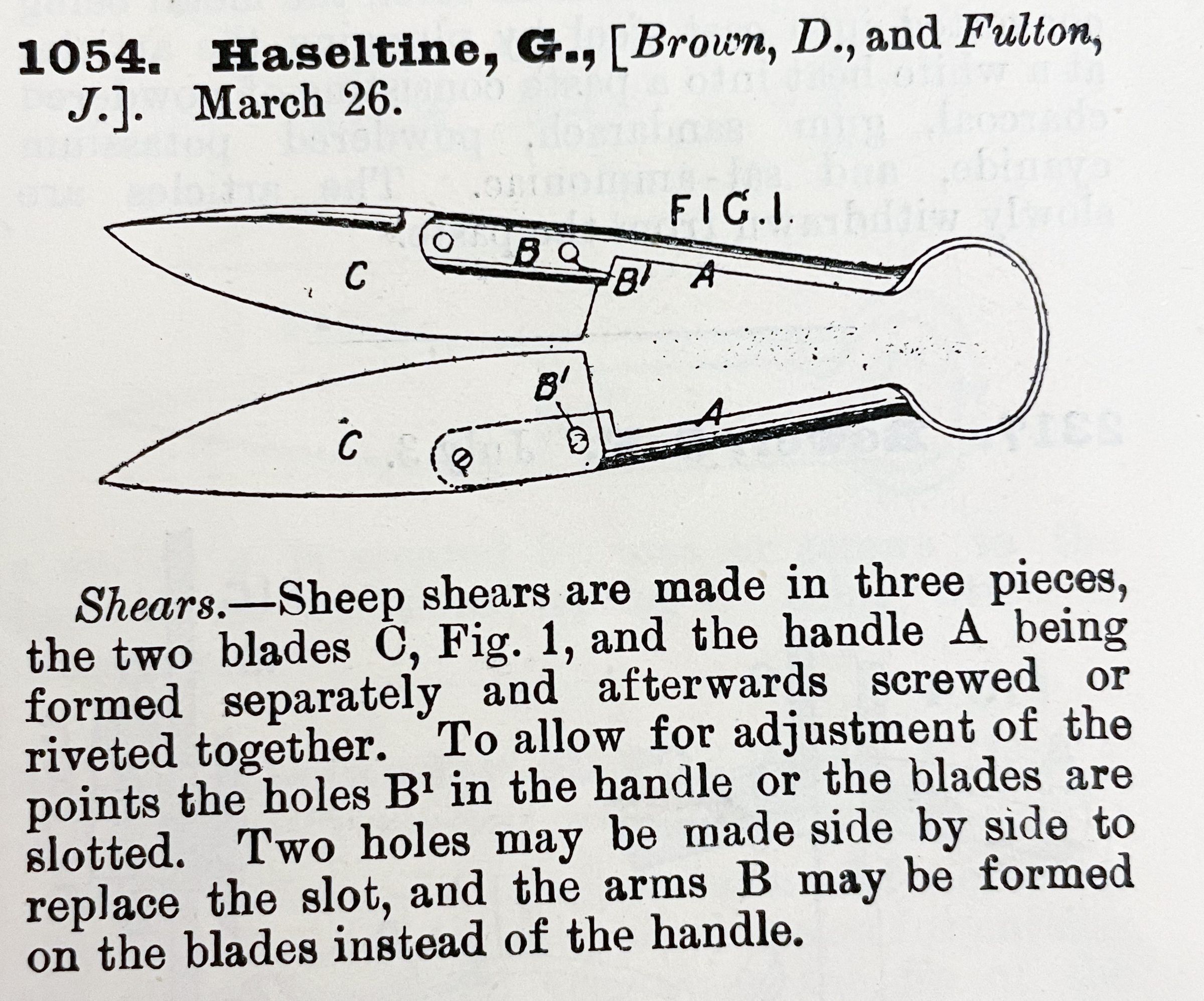 1800s, british, patent summary, shears, sheep, haseltine, brown, fultonDescription