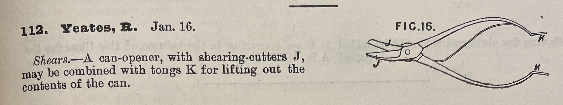 Shears. -- A can-opener, with shearing cutters. J, may be combined with tongs K for lifting out the contents of the can.Cataloged By