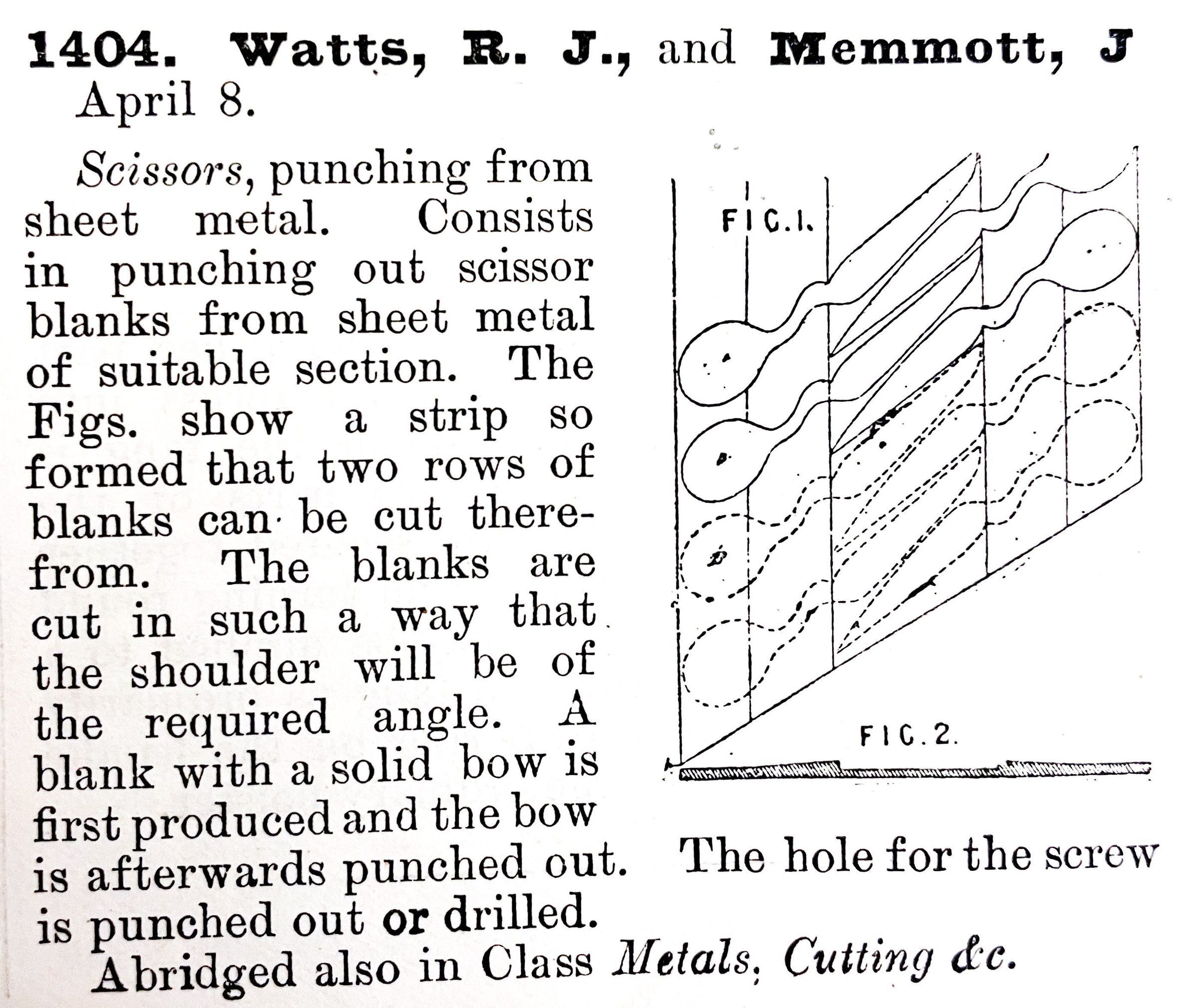 1800s, british, patent summary, scissors, blanks, watts, memmottDescription