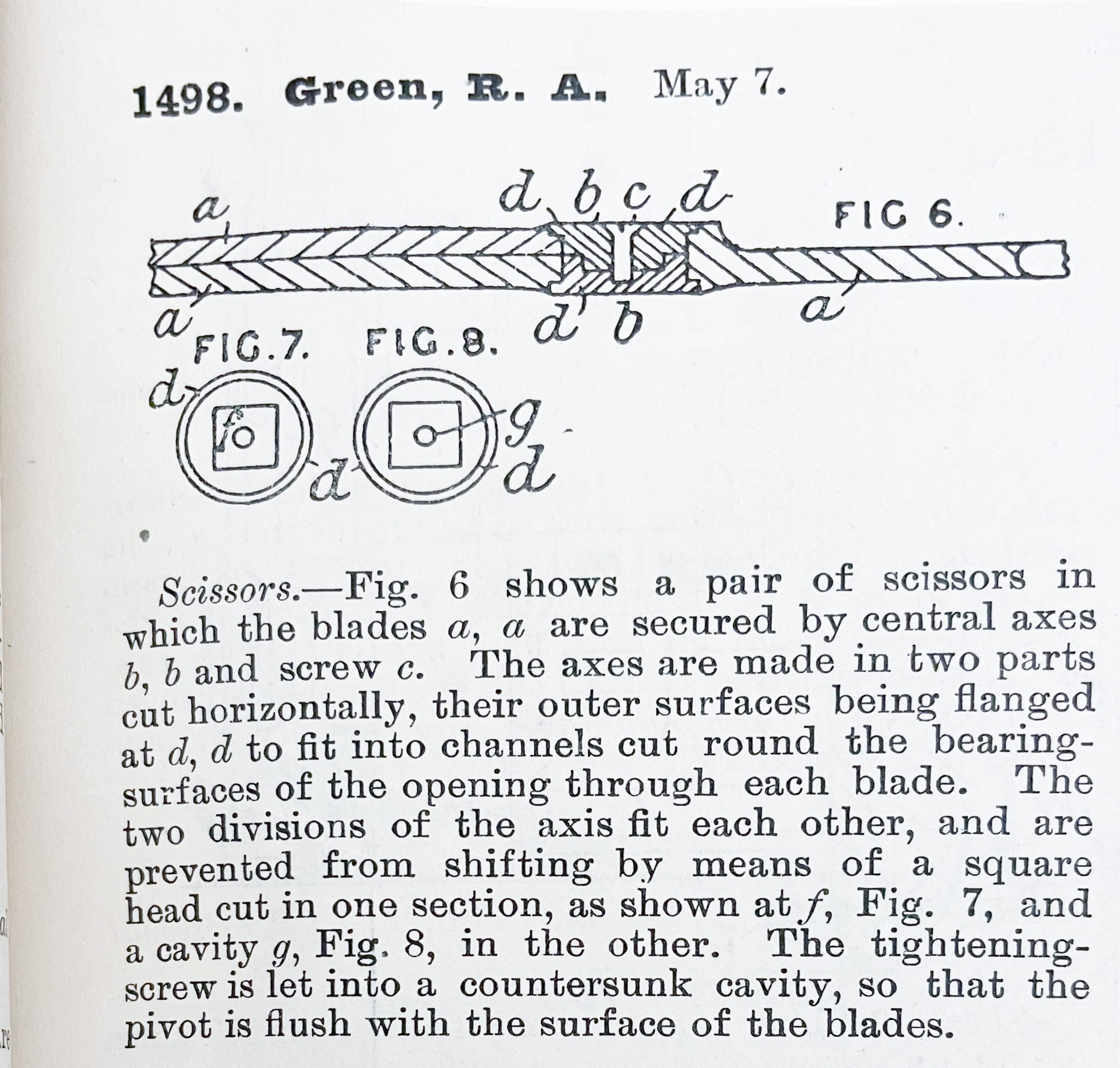 Scissors. -- Fig. 6 shows a pair of scissors in which the blades a, an are secured by central axes b, b and screw c. The axes are made in two parts cut horizontally, their outer surfaces being flanged at d, d to fit into channels cut round the bearing-surfaces of the opening through each blade. The two division of the axis fit each other, and are prevented from shifting by means of a square head cut in one section, as shown at f, Fig. 7, and a cavity g, Fig. 8, in the other. The tightening-screw is let into a countersunk cavity, so that the pivot is flush with the surface of the blades.Cataloged By