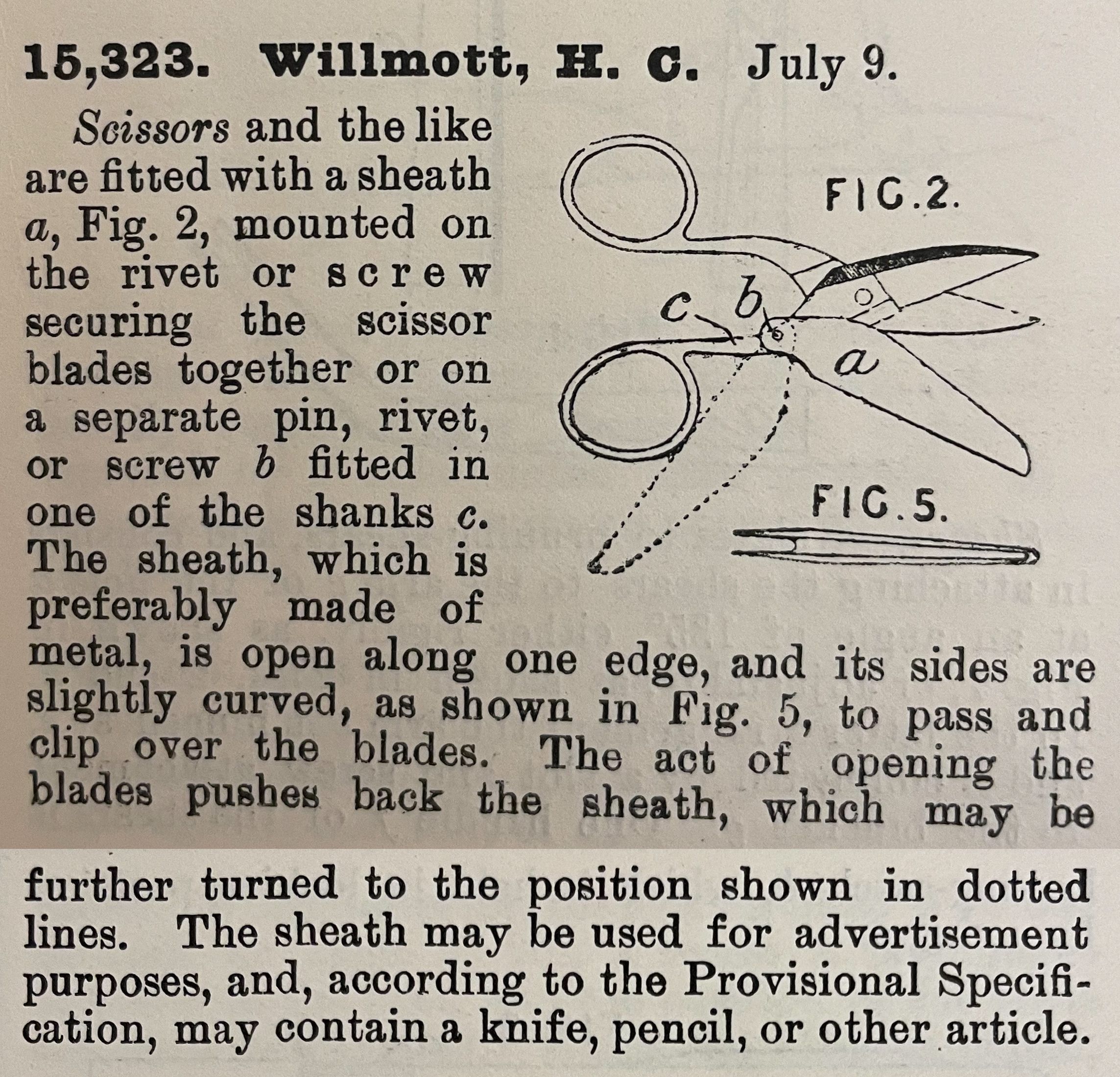 Scissors and the like are fitted with a sheath a, Fig. 2, mounted on the rivet or screw securing the scissor blades together or on a separate pin, rivet, or screw b fitted in one of the shanks c. The sheath, which is preferably made of metal, is open along one edge, and its sides are slightly curved, as shown in Fig. 5, to pass and clip over the blades. The act of opening the blades pushes back the sheath, which may be further turned to the position shown in dotted lines. The sheath may be used for advertisement purposes, and, according to the Provisional Specification, may contain a knife, pencil, or other article.Cataloged By