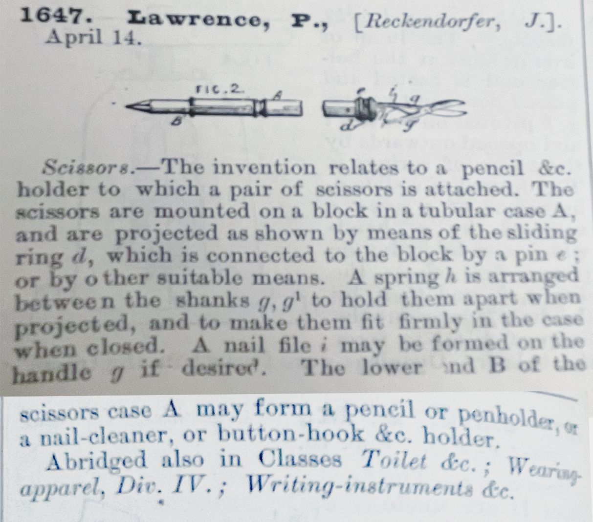 1800s, british, patent summary, scissors, lawrence, reckendorferDescription