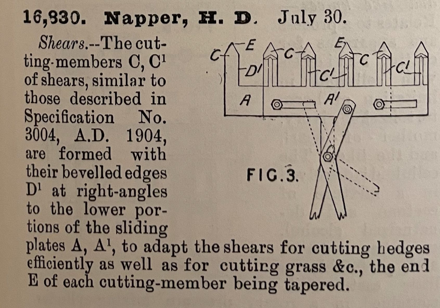 Shears. -- The cutting-members C, C1 of shears, similar to those described in Specification No. 3004, A.D. 1904, are formed with their bevelled edges D1 at right-angles to the lower portions of the sliding plates A, A1, to adapt the shears for cutting hedges efficiently as well as for cutting grass &c., the end E of each cutting-member being tapered.Cataloged By