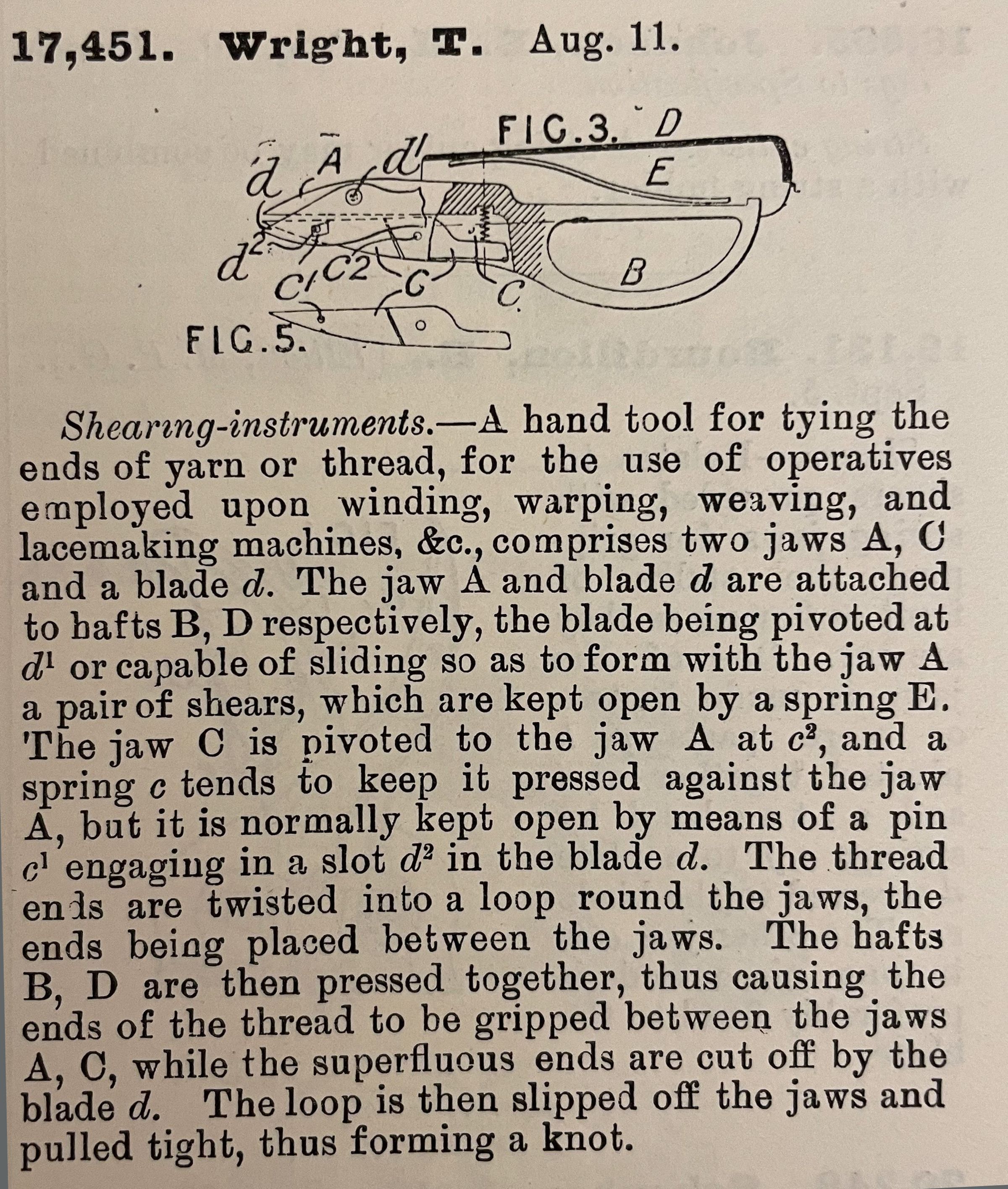 Shearing-instruments. -- A hand tool for tying the ends of yarn or thread, for the use of operatives employed upon winding, warping, weaving, and lacemaking machines, &c., comprises two jaws, A, C and a blade d. The jaw A and blade d are attached to hafts B, D respectively, the blade being pivoted at d1 or capable of sliding so as to form with. the jaw A a pair of shears, which are kept open by a spring E. The jaw C is pivoted to the jaw A at c2, and a spring c tends to keep it pressed against the jaw A, but it is normally kept open by means of a pin c1 engaging in a slot d2 in the blade d. The thread ends are twisted into a loop round the jaws, the ends being placed between the jaws. The hafts B, D are then pressed together, thus causing the ends of the thread to be gripped between the jaws A, C, while the superfluous ends are cut off by the blade d. The loop is then slipped off the jaws and pulled tight, thus forming a knot.Cataloged By