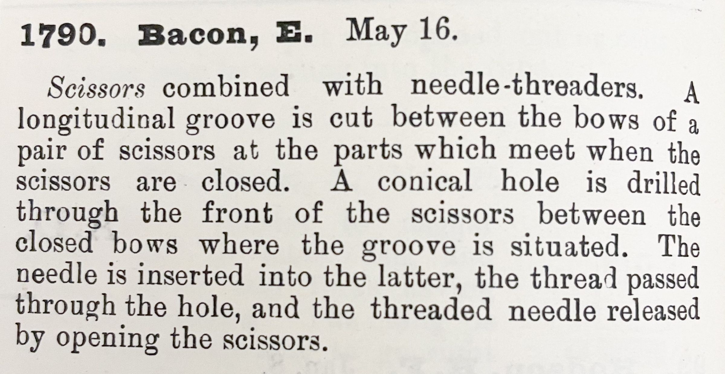 Scissors combined with needle-threaders. A longitudinal groove is cut between the bows of a pair of scissors at the parts which meet when the scissors are closed. A conical hole is drilled through the front of the scissors between the closed bows where the groove is situated. The needle is inserted into the latter, the thread passed through the hole, and the threaded needle released by opening the scissors.Cataloged By
