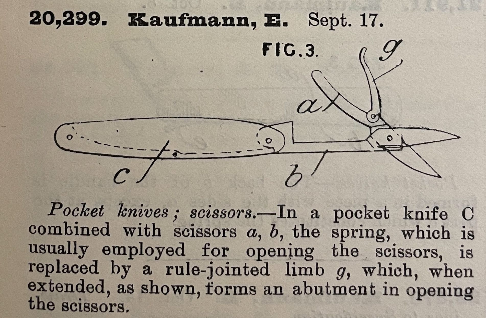Pocket knives; scissors. -- In a pocket knife C combined with scissors a, b, the spring, which is usually employed for opening the scissors, is replaced by a rule-jointed limb g, which, when extended, as shown, forms an abutment in opening the scissors.Cataloged By