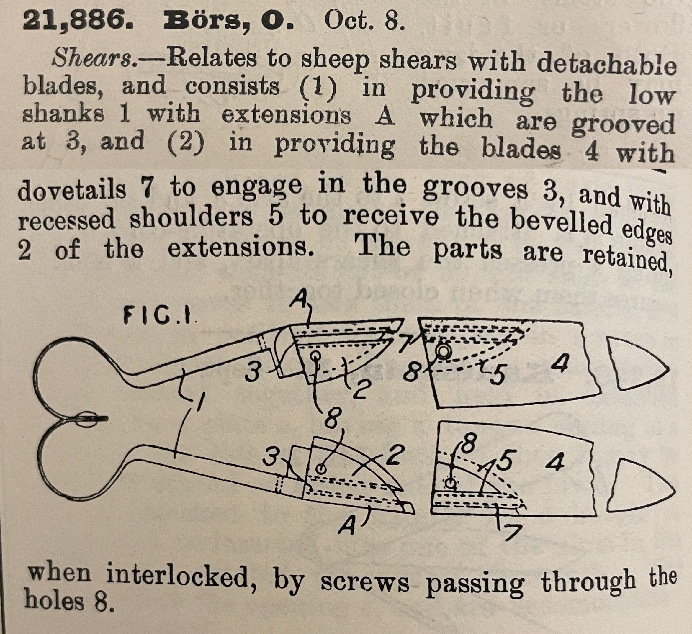 Shears. Relates to sheep shears with detachable blades, and consists (1) in providing the low shanks 1 with extensions A which are grooved at 3, and (2) in providing the blades 4 with dovetails 7 to engage in the grooves 3, and with recessed shoulders 5 to receive the bevelled edges 2 of the extensions. The parts are retained, when interlocked, by screws passing through the holes 8.Cataloged By