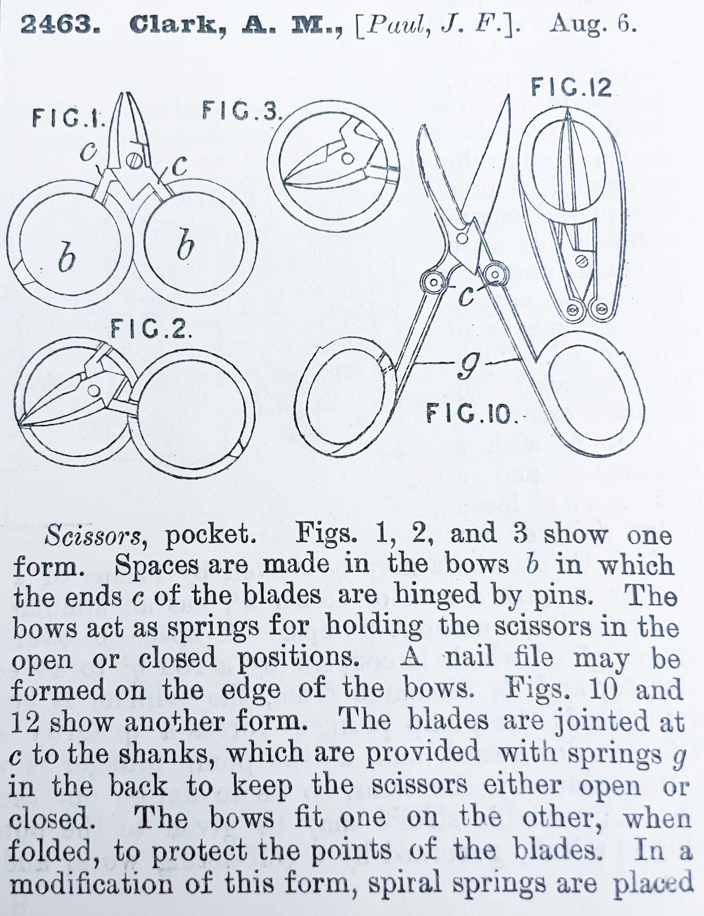 1800s, british, patent summary, scissors, pocket, folding, clark, paulDescription