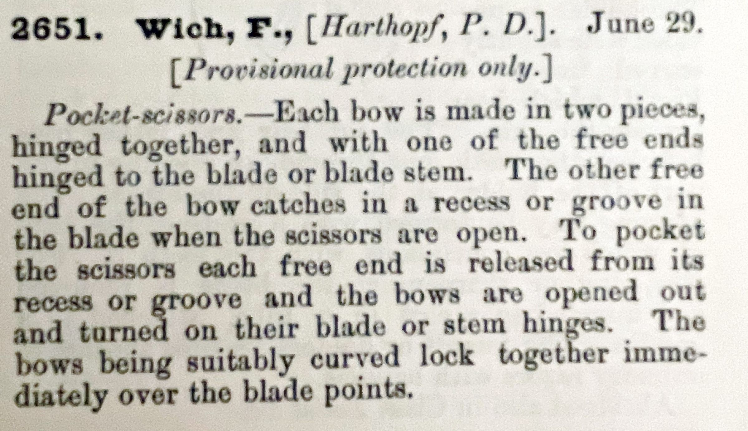 1800s, british, patent summary, pocket, scissors, wich, harthopfDescription