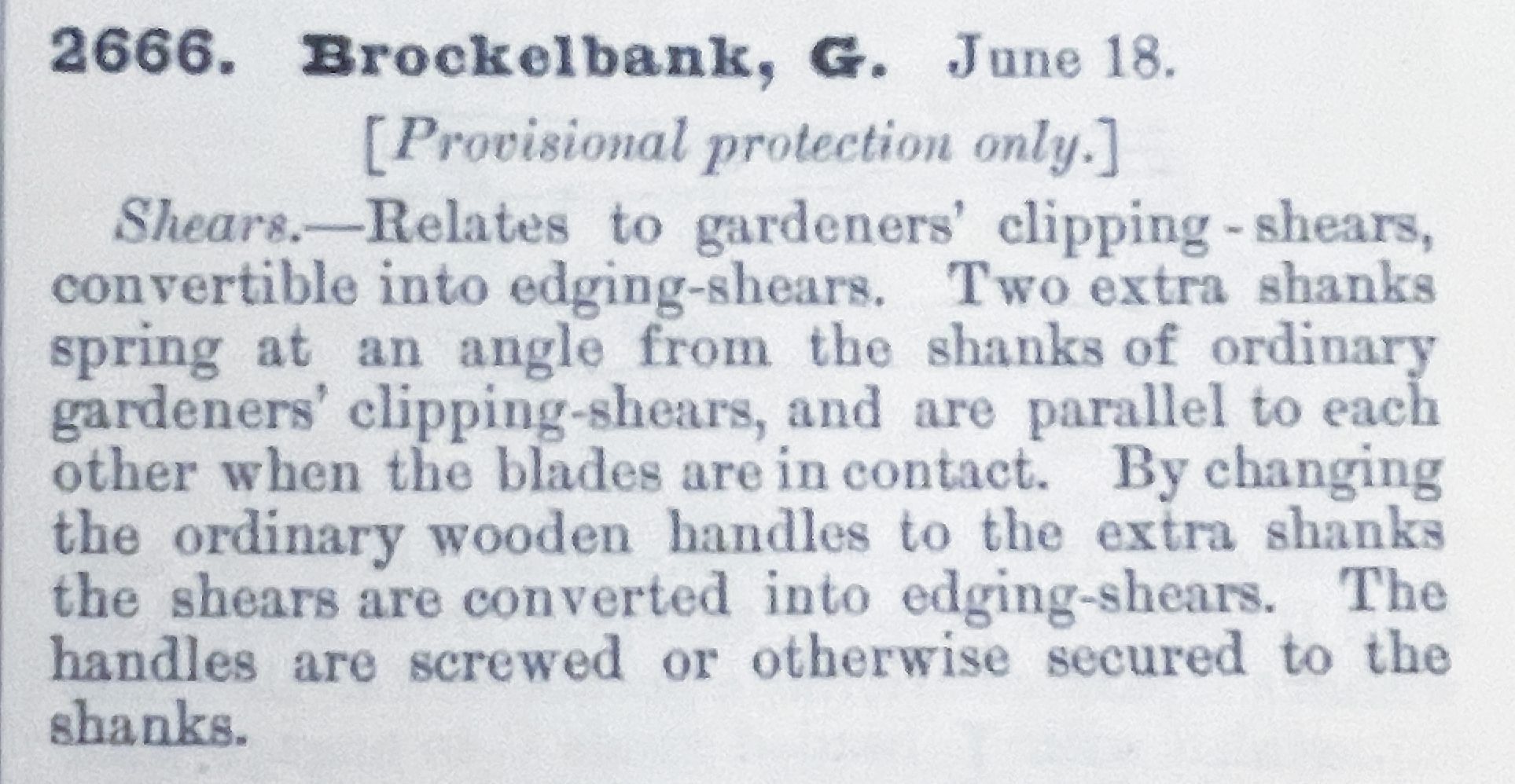 1800s, british, patent summary, shears, garden, brockelbankDescription