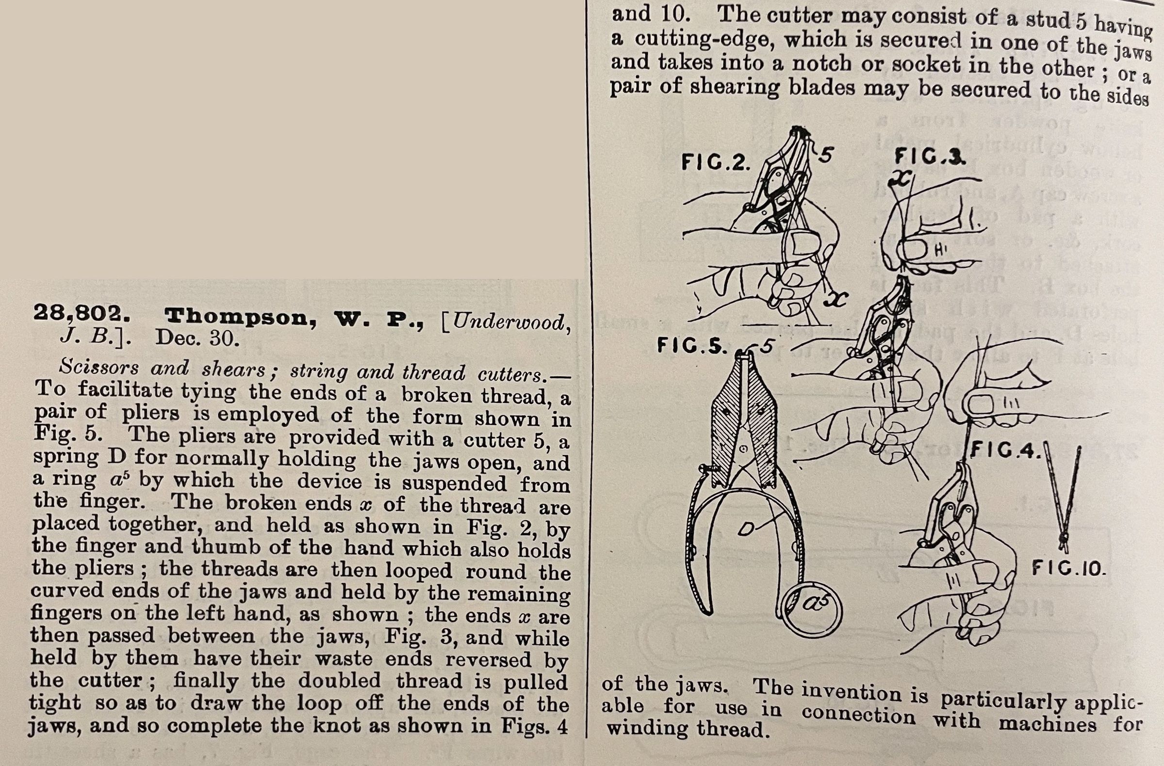Scissors and shears; string and thread cutters. -- To facilitate tying the ends of a broken thread, a pair of pliers is employed of the form shown in Fig. 5. The pliers are provided with a cutter 5, a spring D for normally holding the jaws open, and a ring a5 by which the device is suspended from the finger. The broken ends x of the thread are placed together, and held as show in Fig. 2, by the finger and thumb of the hand which also holds the pliers; the threads are then looped round the curved ends of the jaws and held by the remaining fingers on the left hand, as shown; the ends x are then passed between the jaws, Fig. 3, and while held by them have their waste ends reversed by the cutter; finally the doubled thread is pulled tight so as to draw the loop off the ends of the jaws, and so complete the knot as shown in Figs. 4 and 10. The cutter may consist of a stud 5 having a cutting-edge, which is secured in one of the jaws and takes into a notch or socket in the other; or a pair of shearing blades may be secured to the sides of the jaws. The invention is particularly applicable for use in connection with machines for winding thread.Cataloged By