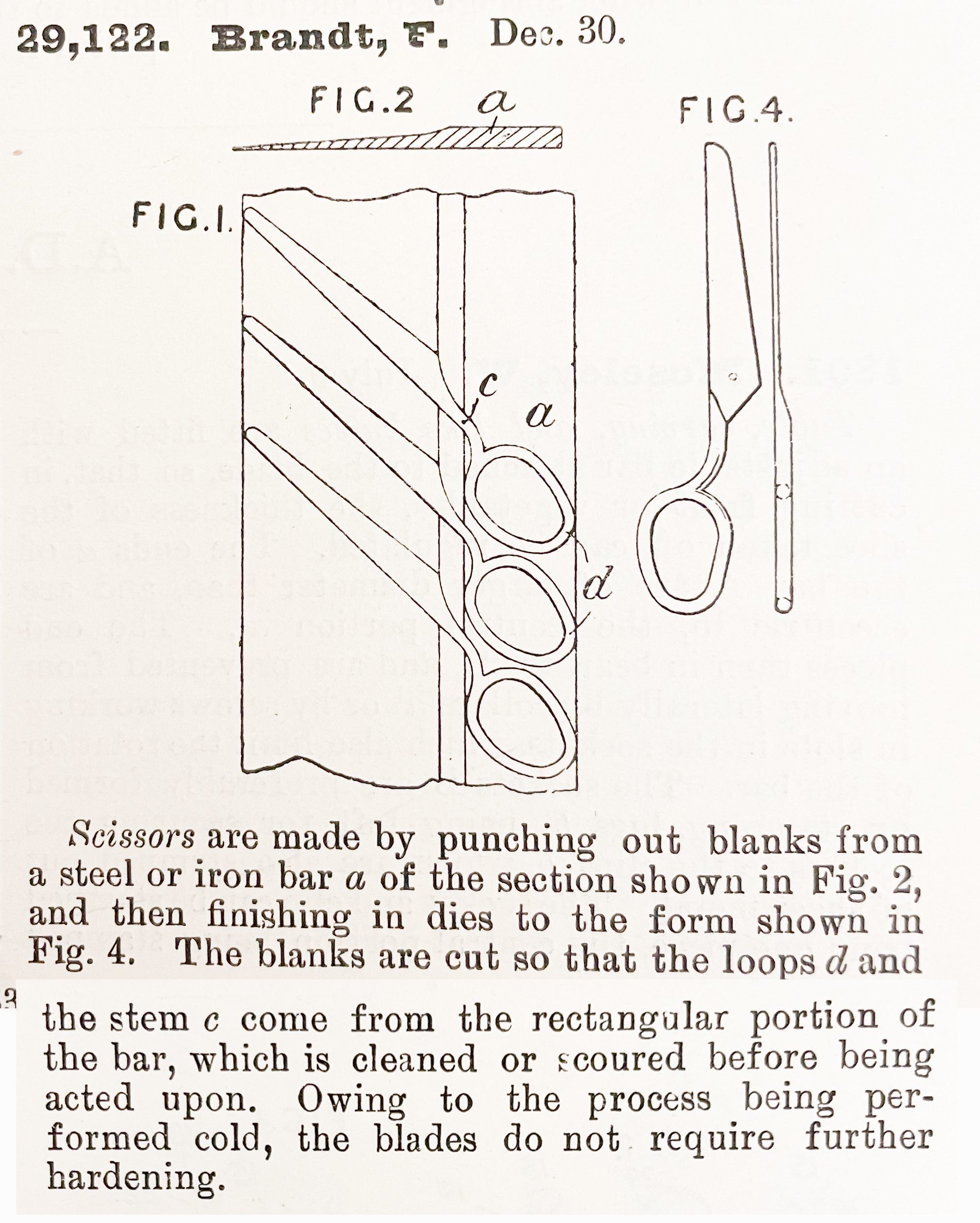 Scissors are made by punching out blanks from a steel or iron bar a of the section shown in Fig. 2, and then finishing in dies to the form shown in Fig. 4. The blanks are cut so that the loops d and the stem c come from the rectangular portion of the bar, which is cleaned or scoured before being acted upon. Owing to the process being performed cold, the blades do not require further hardening.Cataloged By