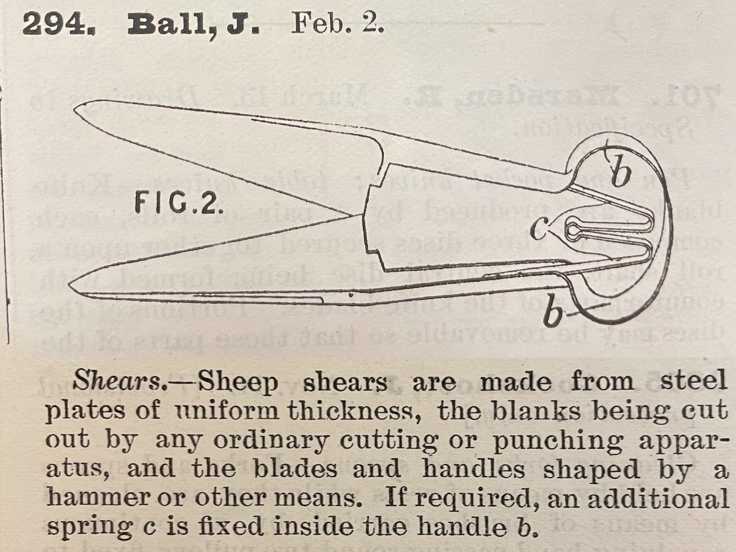 Shears. -- Sheep shears are made from steel plates of uniform thickness, the blanks being cut out by any ordinary cutting or punching apparatus, and the blades and handles shaped by a hammer or other means. If required, an additional spring c is fixed inside the handle b.Cataloged By