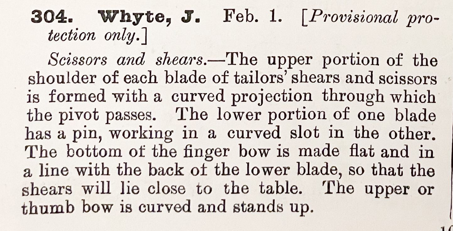 1800s, british, patent summary, scissors, shears, tailor, whyteDescription
