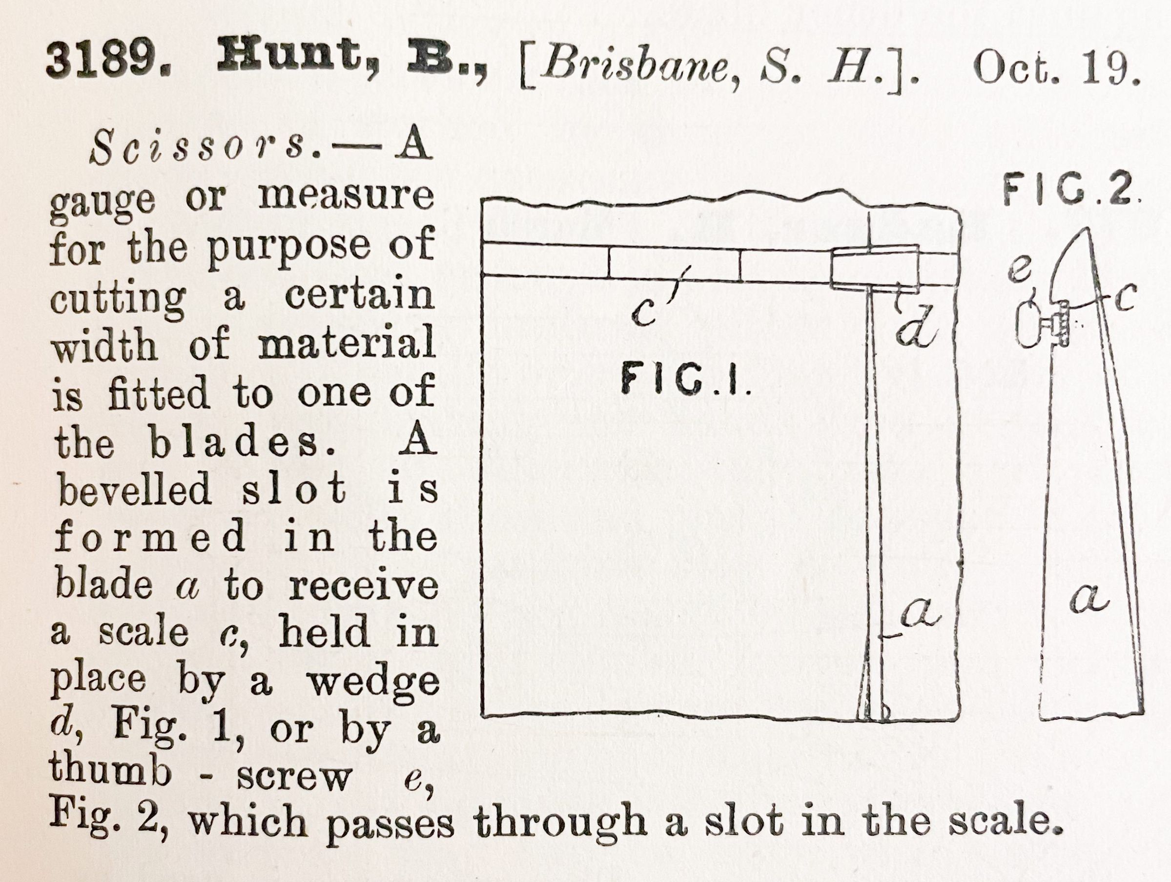 1800s, british, patent summary, scissors, hunt, brisbaneDescription