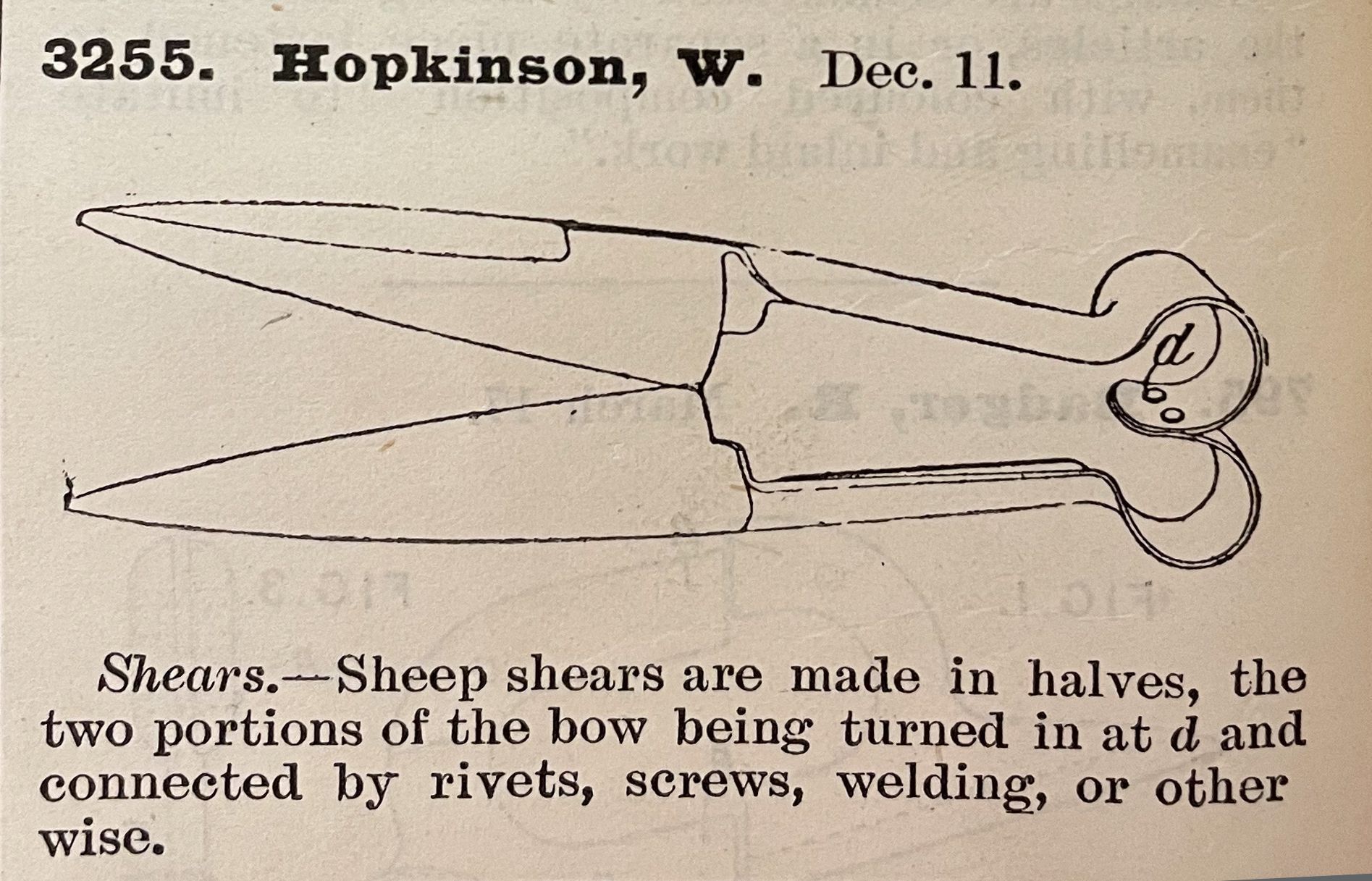Shears. -- Sheep shears are made in halves, the two portions of the bow being turned in at d and connected by rivets, screws, welding, or other wise.Cataloged By