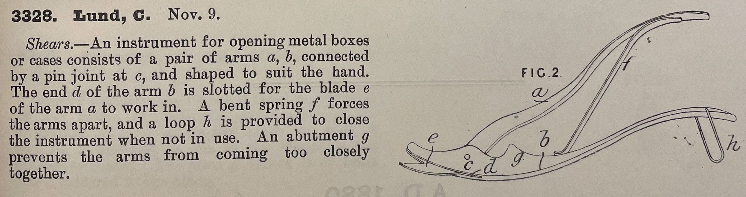 Shears. -- An instrument for opening metal boxes or cases consists of a pair of arms a, b, connected by a pin joint at c, and shaped to suit the hand. The end d of the arm b is slotted for the blade c of the arm a to work in. A bent spring f forces the arms apart, and a loop h is provided to close the instrument when not in use. An abutment g prevents the arms from coming too closely together.Cataloged By