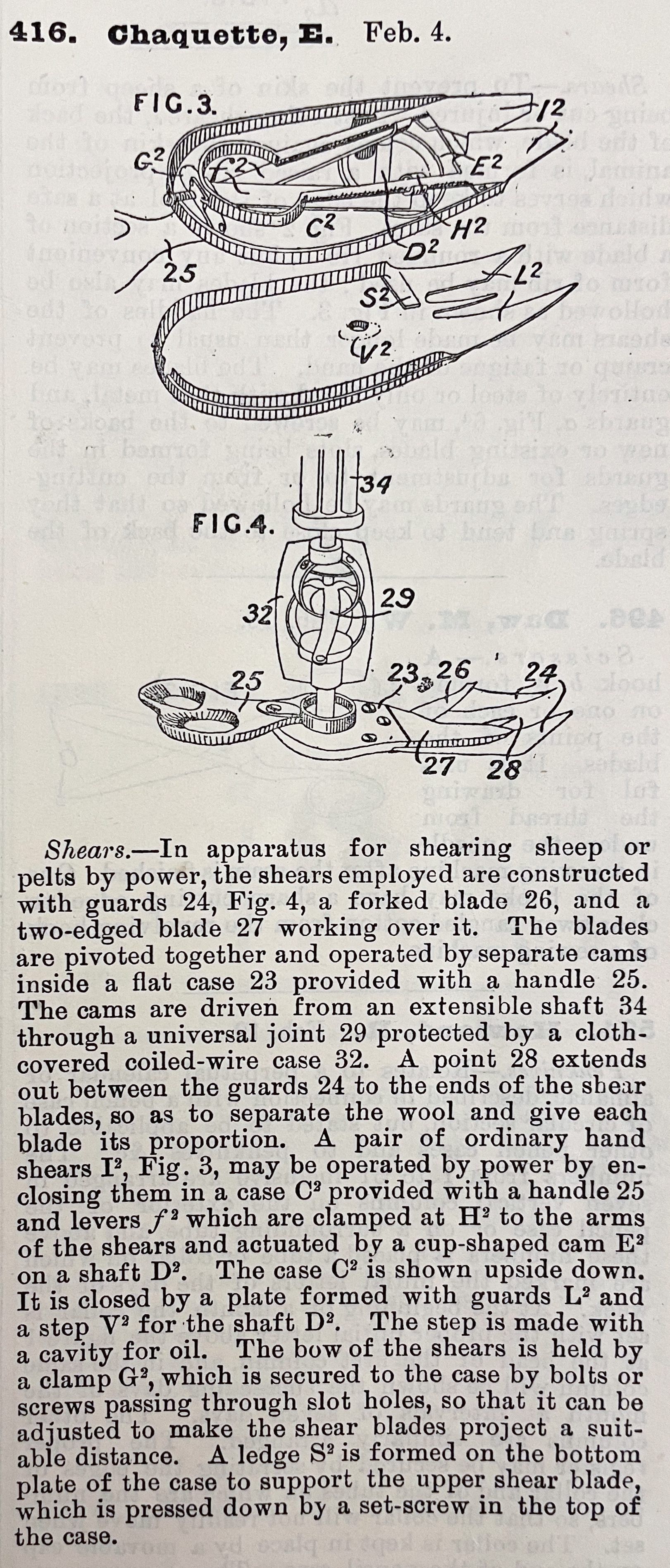 Shears. -- In apparatus for shearing sheep or pelts by power, the shears employed are constructed with guards 24, Fig. 4, a forked blade 26, and a two-edged blade 27 working over it. The blades are pivoted together and operated by separate cams inside a flat case 23 provided with a handle 25. The cams are driven from an extensible shaft 34 through a universal joint 29 protected by a cloth-covered coiled-wire case 32. A point 28 extends out between the guards 24 to the ends of the shear blades, so as to separate the wool and give each blade its proportion. A pair of ordinary hand shears I2, Fig. 3, may be operated by power by enclosing them in a case C2 provided with a handle 25 and levers f2 which are clamped at H2 to the arms of the shears and actuated by a cup-shaped cam E2 on a shaft D2. The case C2 is shown upside down. It is closed by a plate formed with guards L2 and a step V2 for the shaft D2. The step is made with a cavity for oil. The bow of the shears is held by a clamp G2, which is secured to the case by bolts or screws passing through slot holes, so that it can be adjusted to make the shear blades project a suitable distance. A ledge S2 is formed on the bottom plate of the case to support the upper shear blade, which is pressed down by a set-screw in the top of the case.Cataloged By