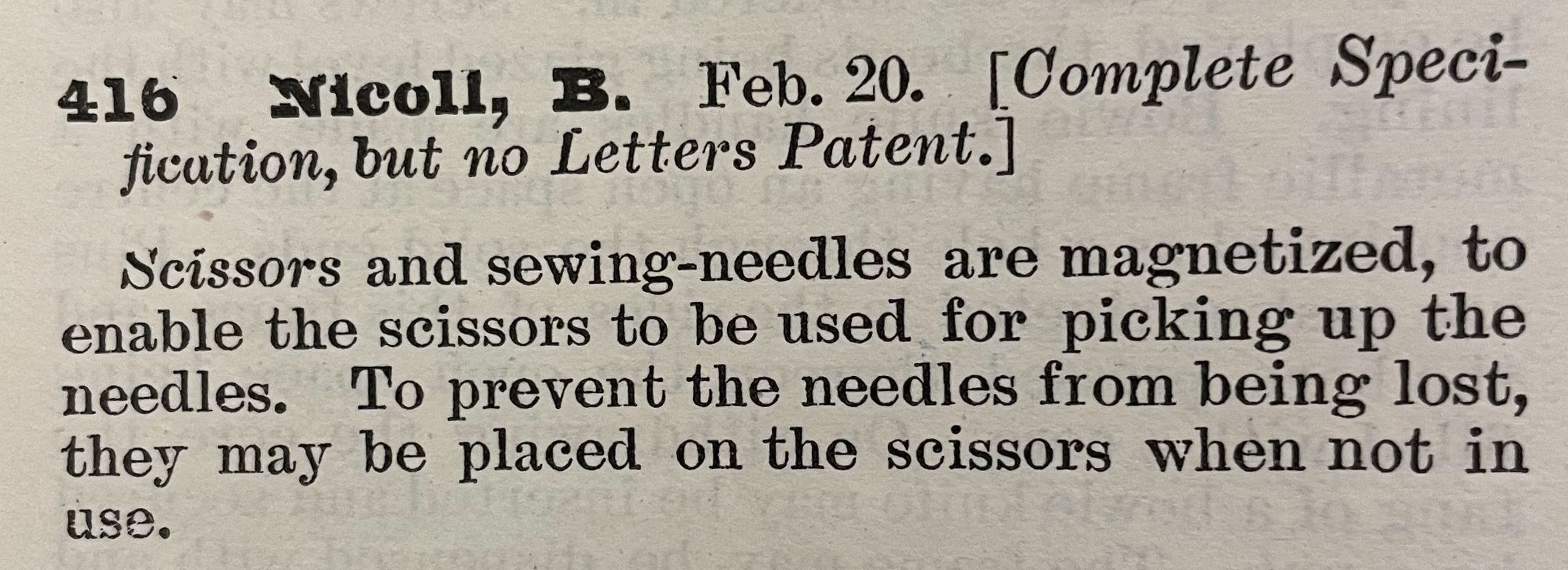 Scissors and sewing-needles are magnetized, to enable the scissors to be used for picking up the needles. To prevent the needles from being lost, they may be placed on the scissors when not in use.Cataloged By