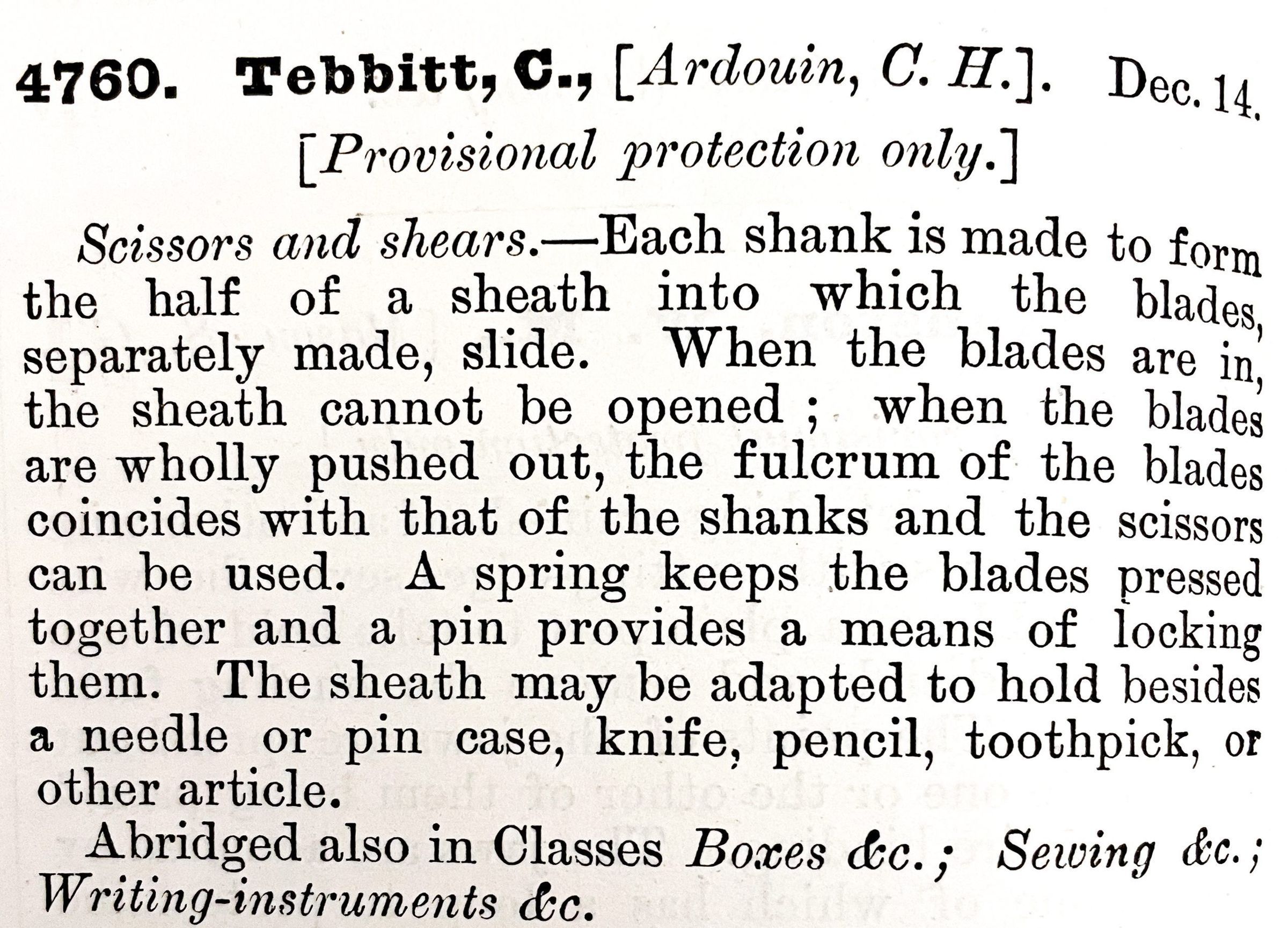 1800s, british, patent summary, scissors, shears, tebbitt, ardouinDescription