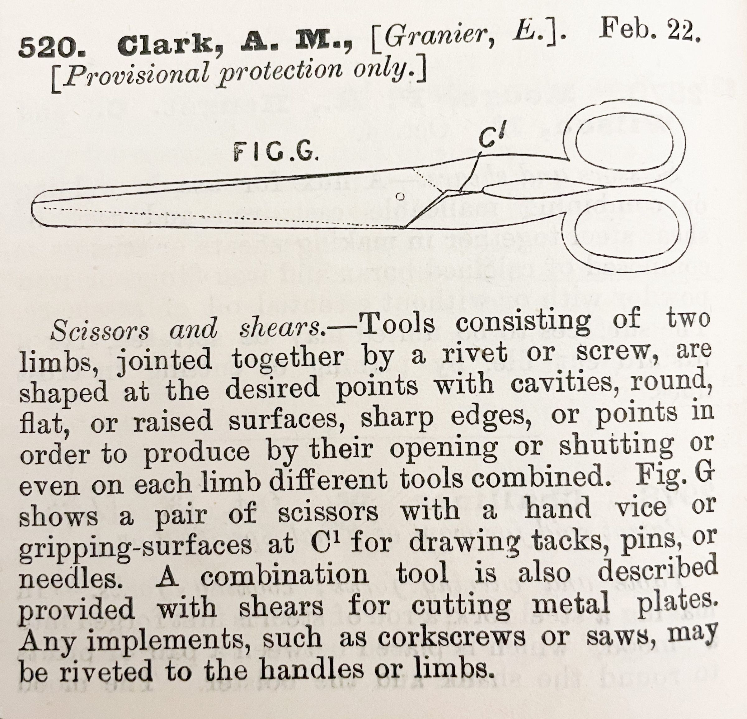 1800s, british, patent summary, scissors, shears, clark, granierDescription