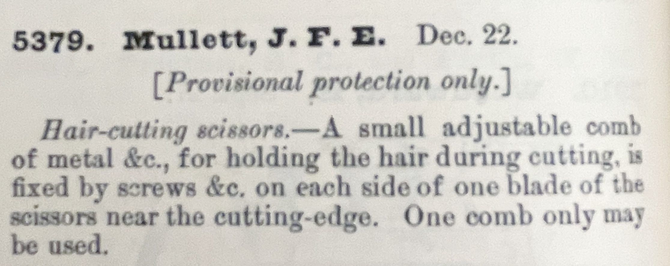 1800s, british, patent summary, scissors, hairdressing, mullettDescription