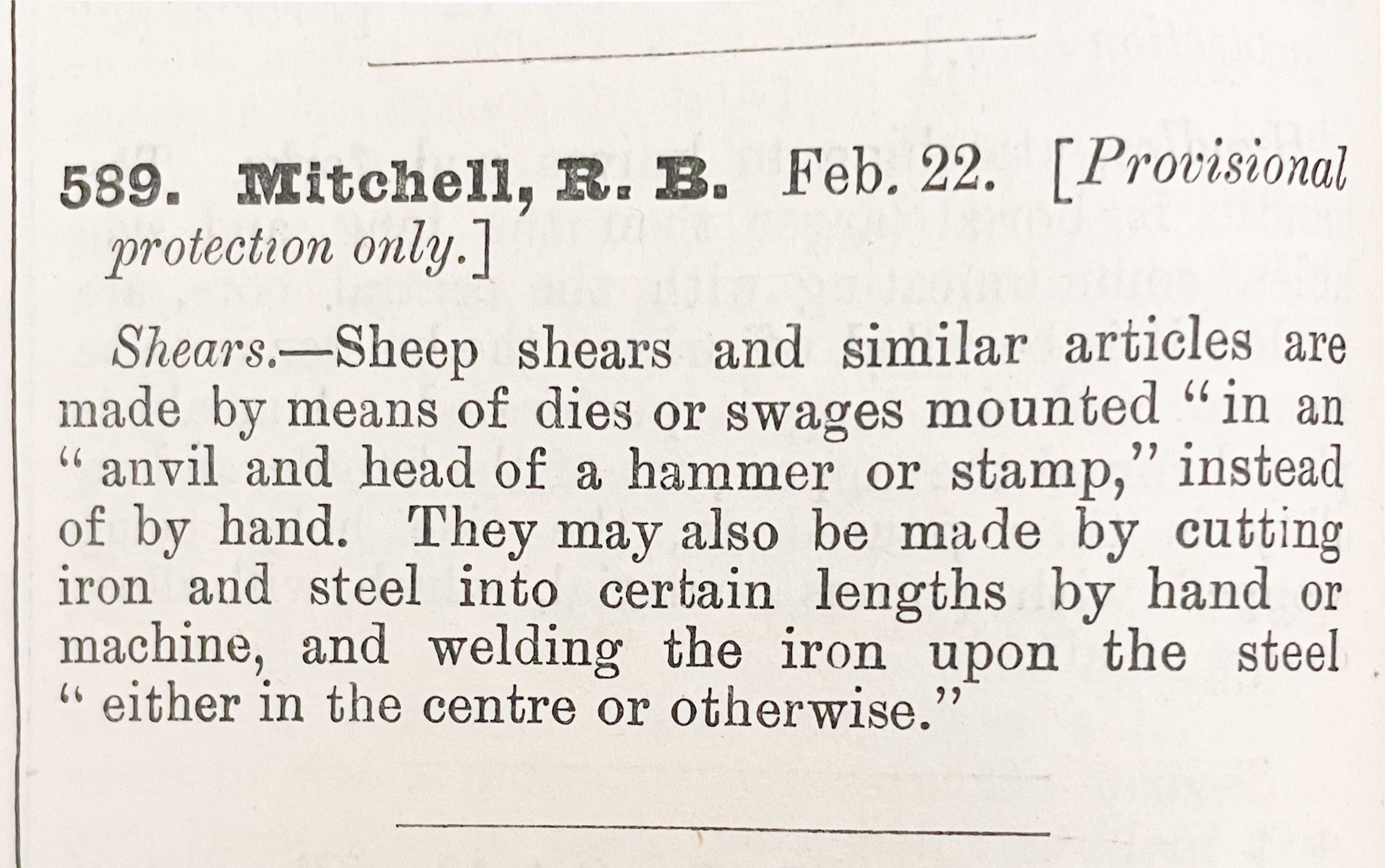 1800s, british, patent summary, shears, sheep, mitchellDescription