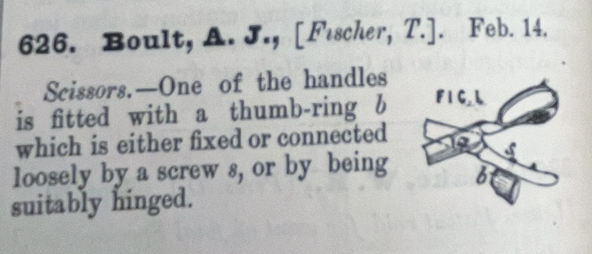 Scissors. -- One of the handles is fitted with a thumb-ring b which is either fixed or connected loosely by a screw s, or by being suitably hinged.Cataloged By