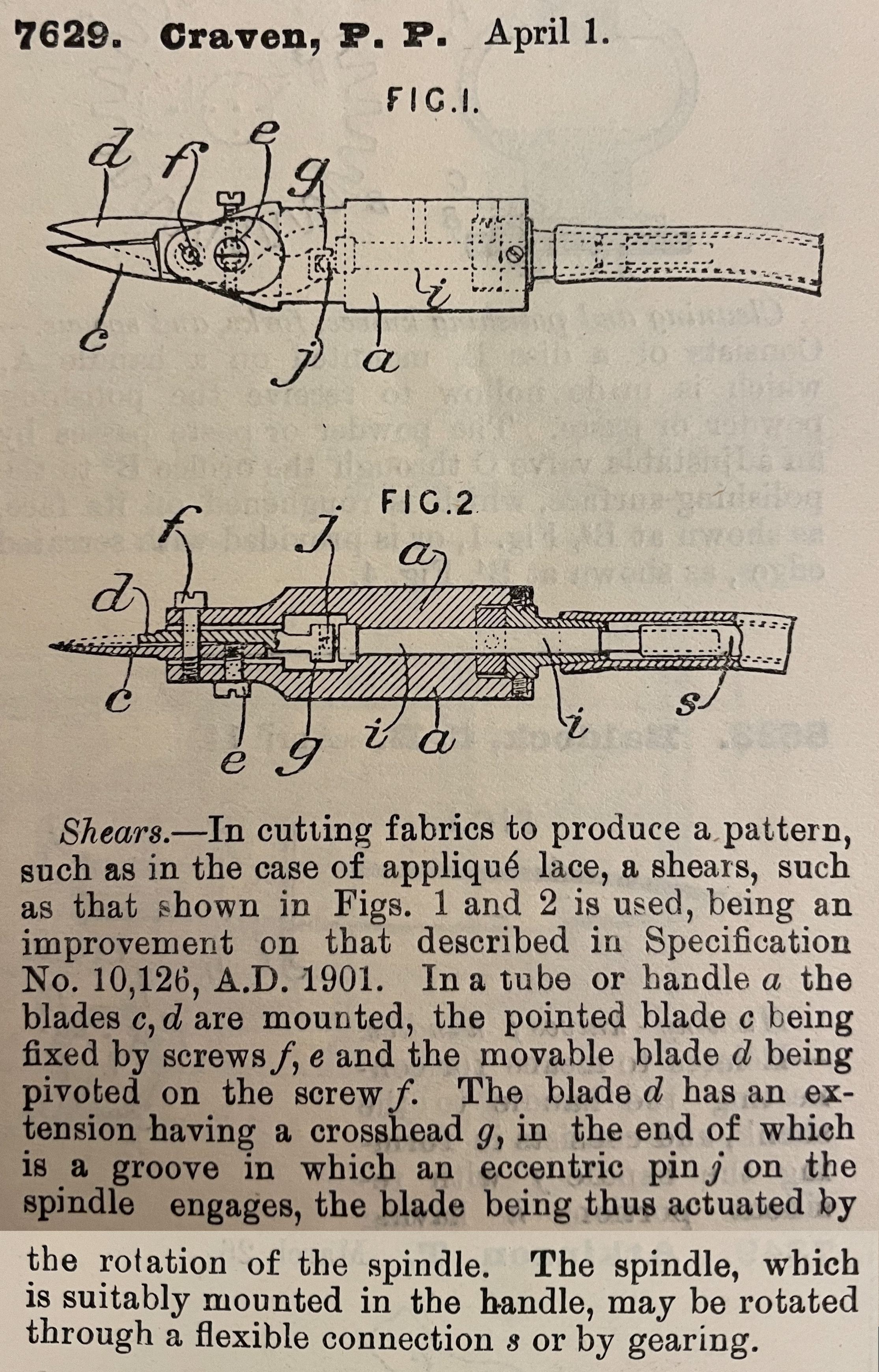 Shears. -- In cutting fabrics to produce a pattern, such as in the case of appliqué lace, a shears, such as that shown in Figs. 1 and 2 is used, being an improvement on that described in Specification No. 10,126, A.D. 1901. In a tube or handle a the blades c, d are mounted, the pointed blade c being fixed by screws f, e and the movable blades d being pivoted on the screw f. The blade d has an extension having a crosshead g, in the end of which is a groove in which an eccentric pin j on the spindle edges, the blade being thus actuated by the rotation of the spindle. The spindle, which is suitably mounted in the handle, may be rotated through a flexible connection s or by gearing.Cataloged By